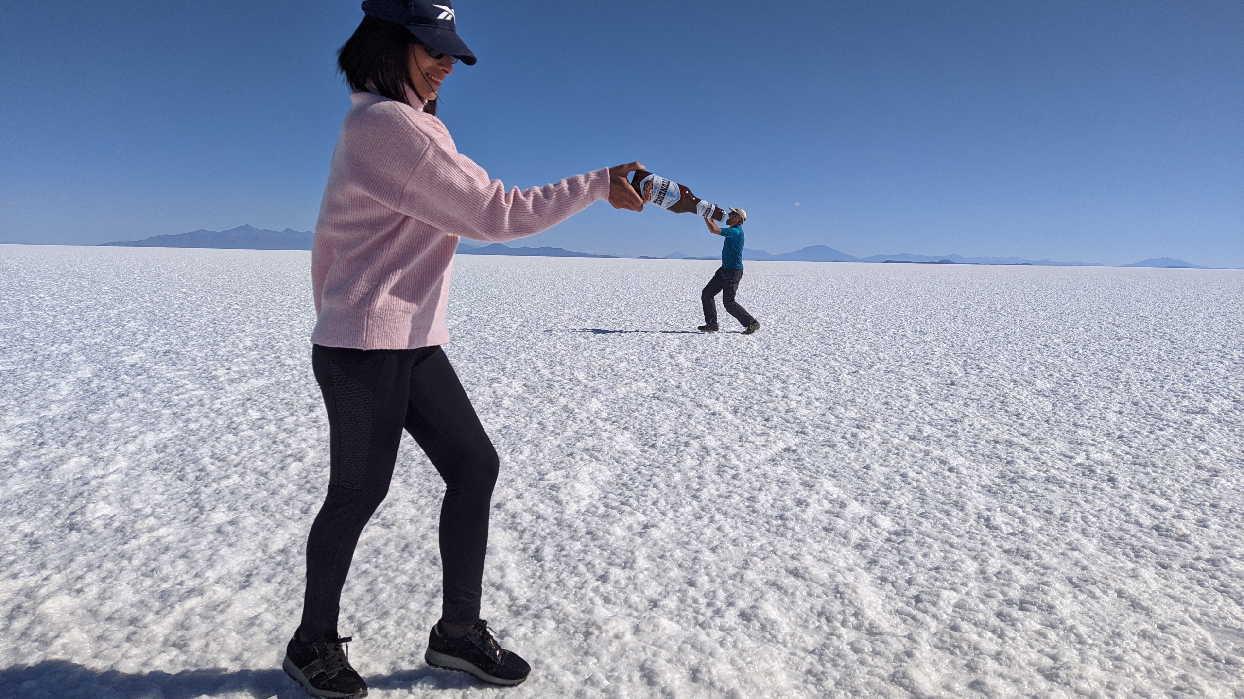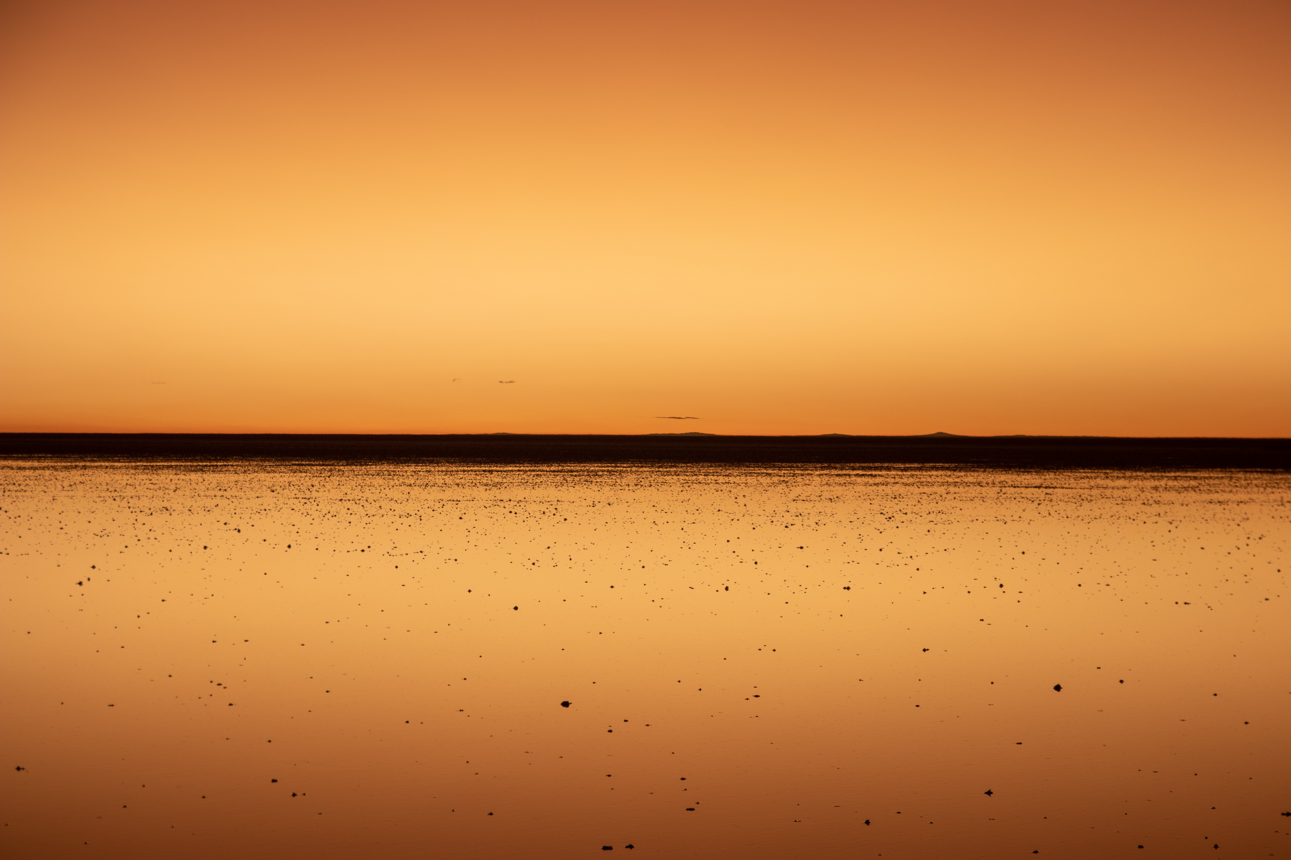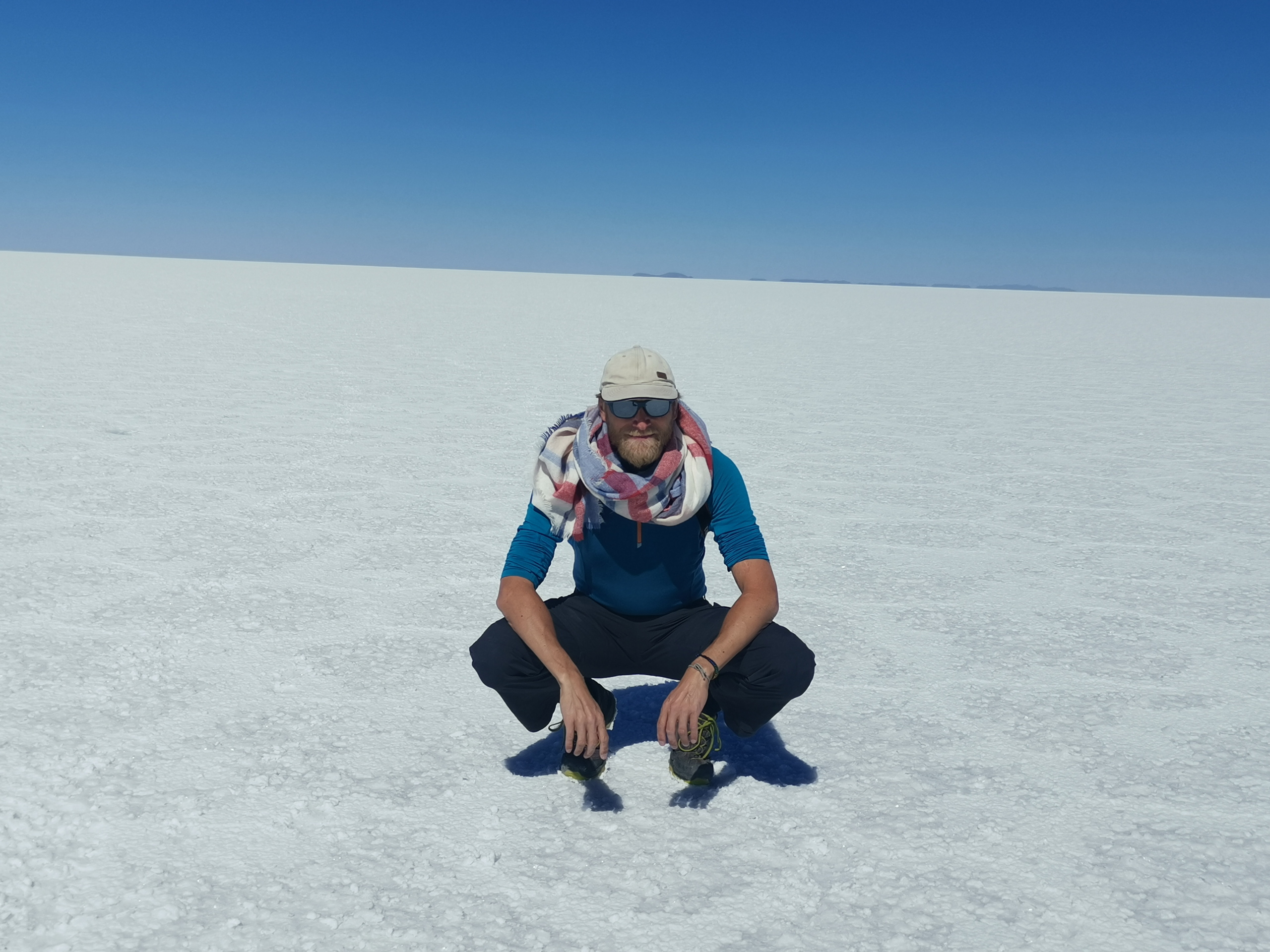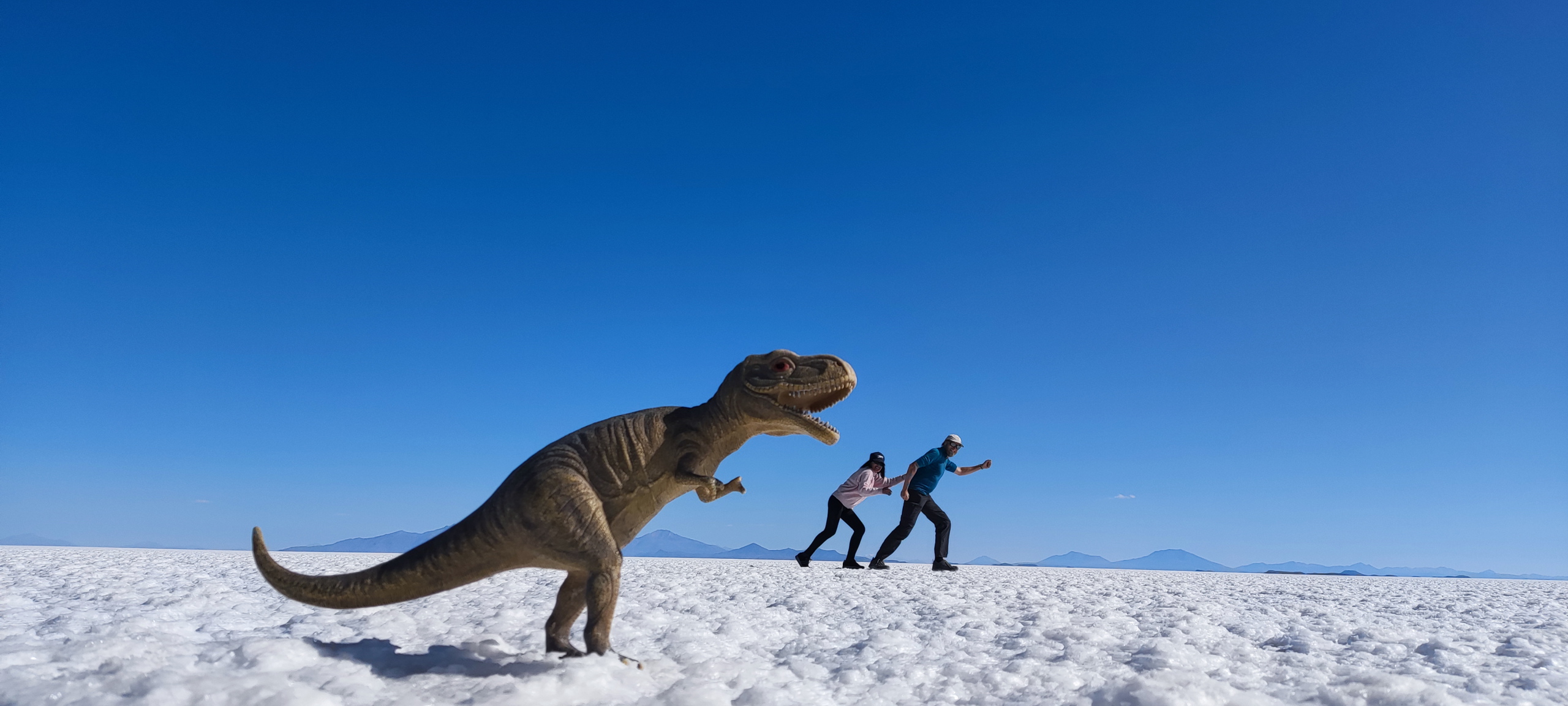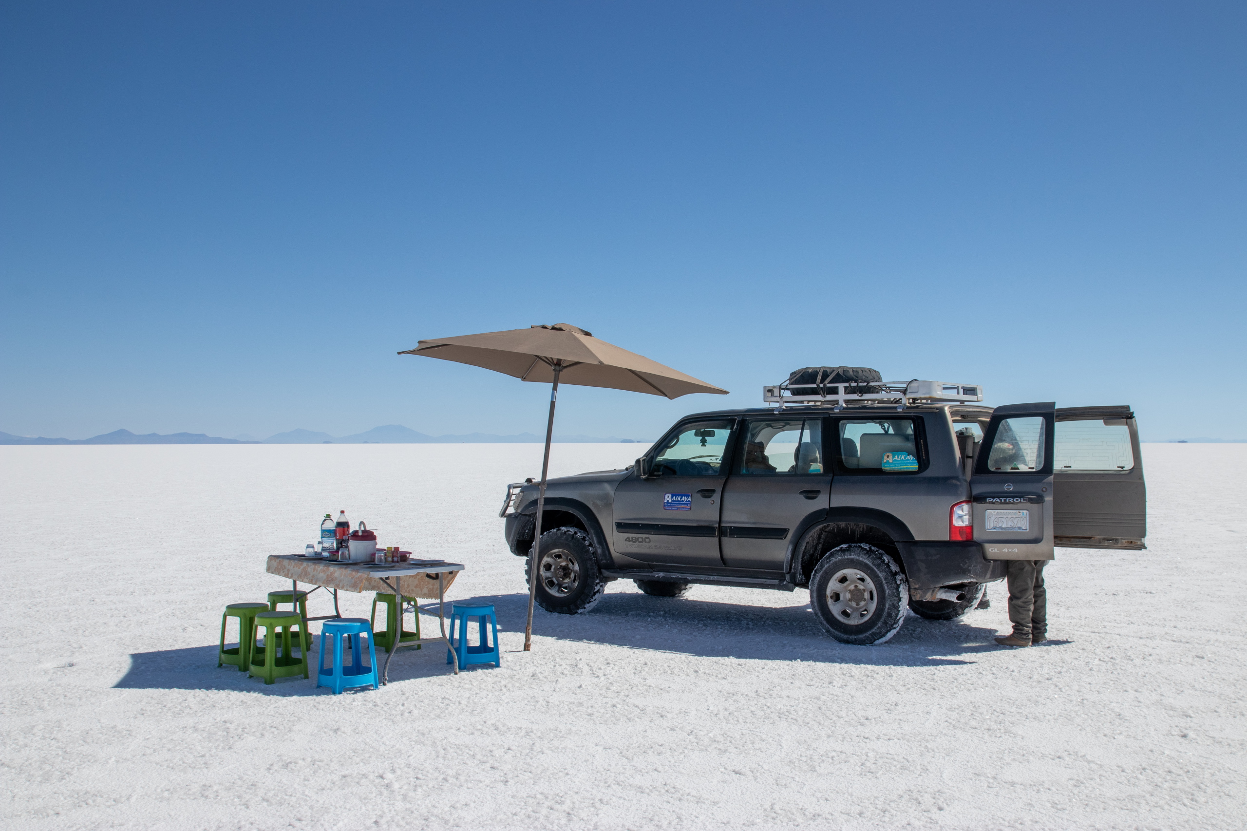 Bevor es weitergeht werden Gummistiefel ausgeteilt. Mit entspannten 140 Sachen krachen wir in Richtung Uyuni, wo noch Reste vom Wasser aus der Regenzeit sind. Es weht kein Lüftchen und das Wasser ist spiegelglatt. Wir machen viele Fotos und unser Fahrer macht ein Video, während er uns mit dem Auto umkreist. Der Sonnenuntergang fällt leider etwas mau aus, da die Wolken fehlen. Aber das ist Jammern auf hohem Niveau.