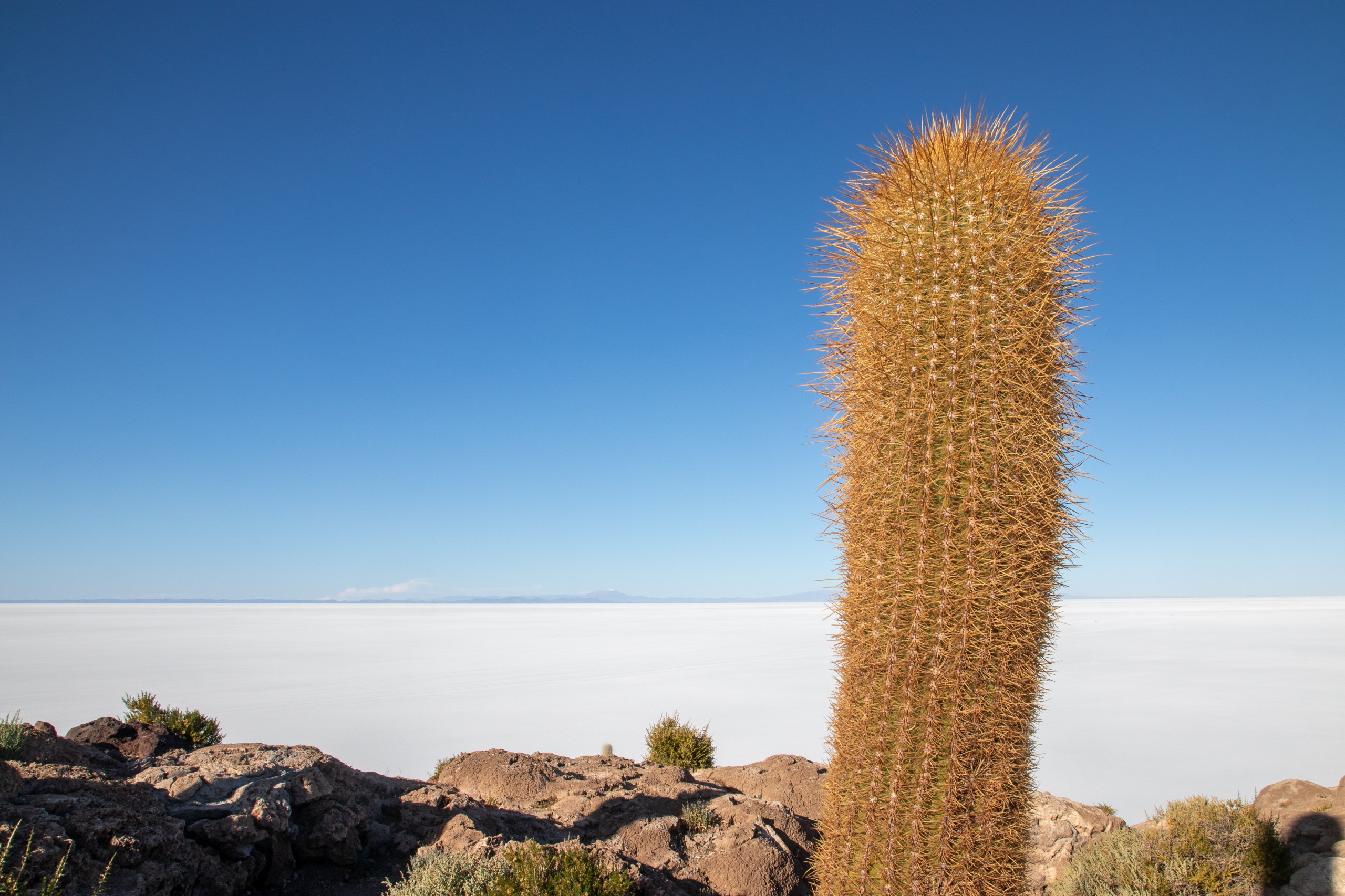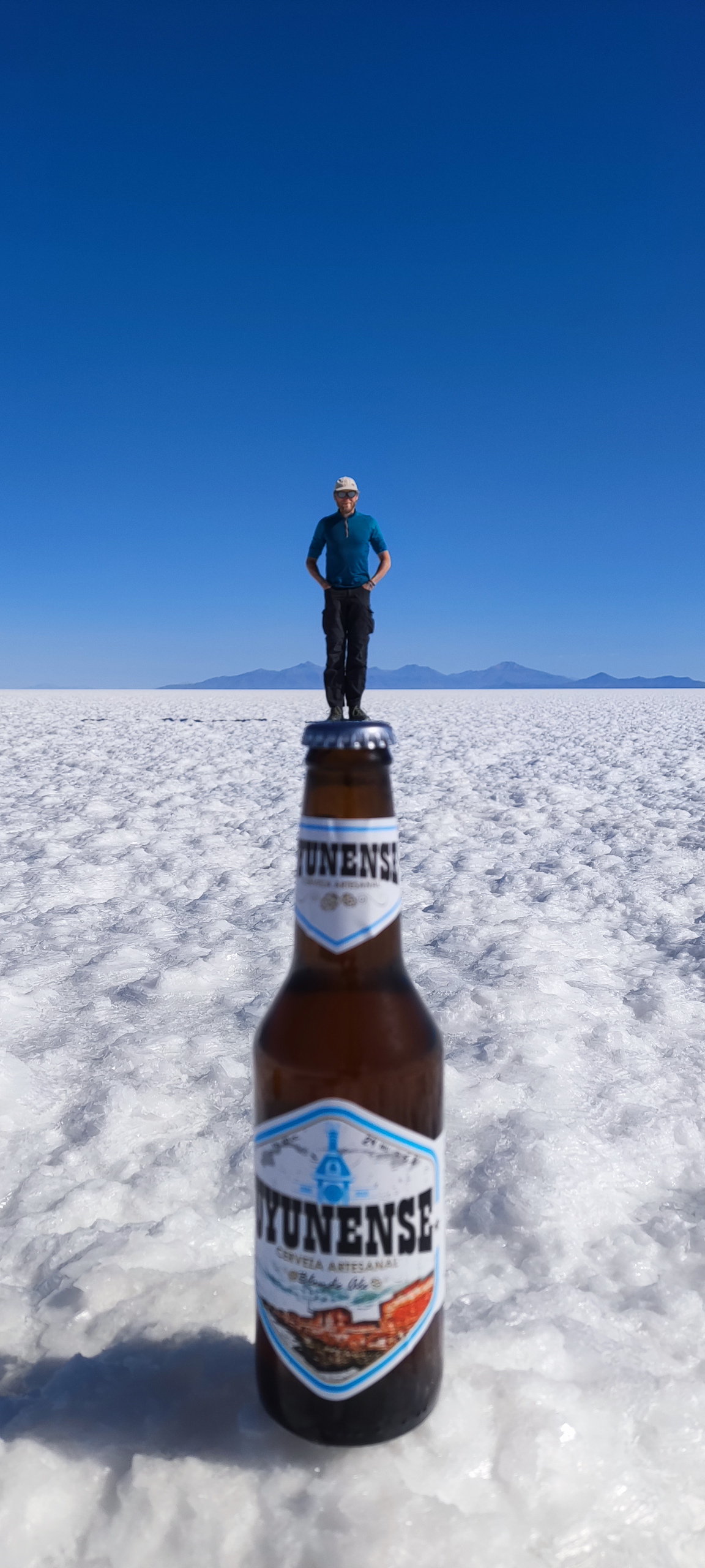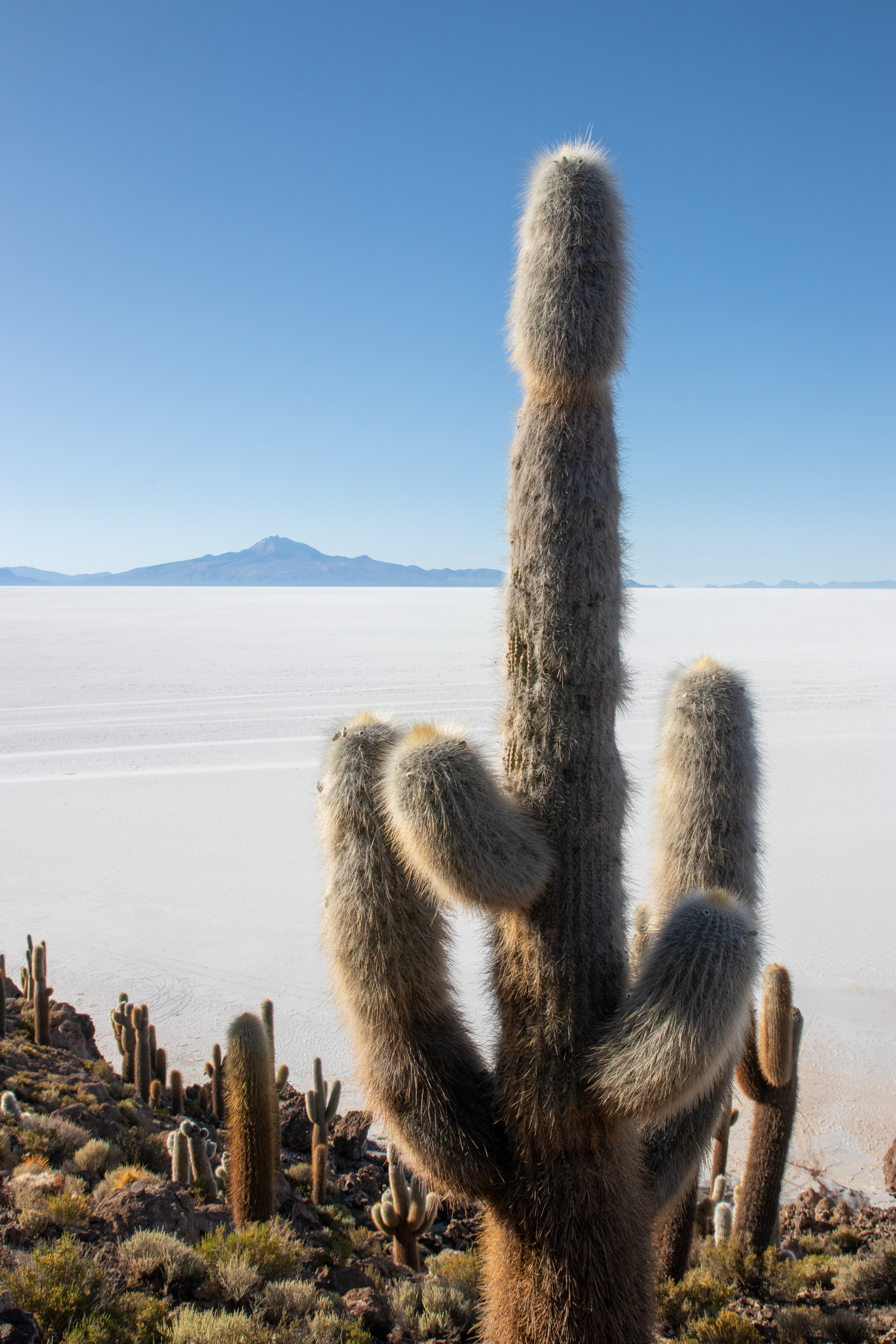 Mit 120 Sachen blasen wir in Richtung Isla Incahuasi. Mitten in der Salar hält unser Fahrer an. Wir sollen uns ein wenig die Gegend ansehen während er alles für das Mittagessen vorbereitet. Tisch, Sessel, Sonnenschirm und alles, was eben so dazu gehört. Ein Stück weiter machen wir die klassischen Fotos und die Bierflasche kommt zum Einsatz. Man kann klar erkennen, dass ich auf Bier stehe. 😁 Für die Isla Incahuasi ist diesmal auch etwas mehr Zeit und da ich vieles schon kenne, kann ich mich aufs Fotografieren konzentrieren.
