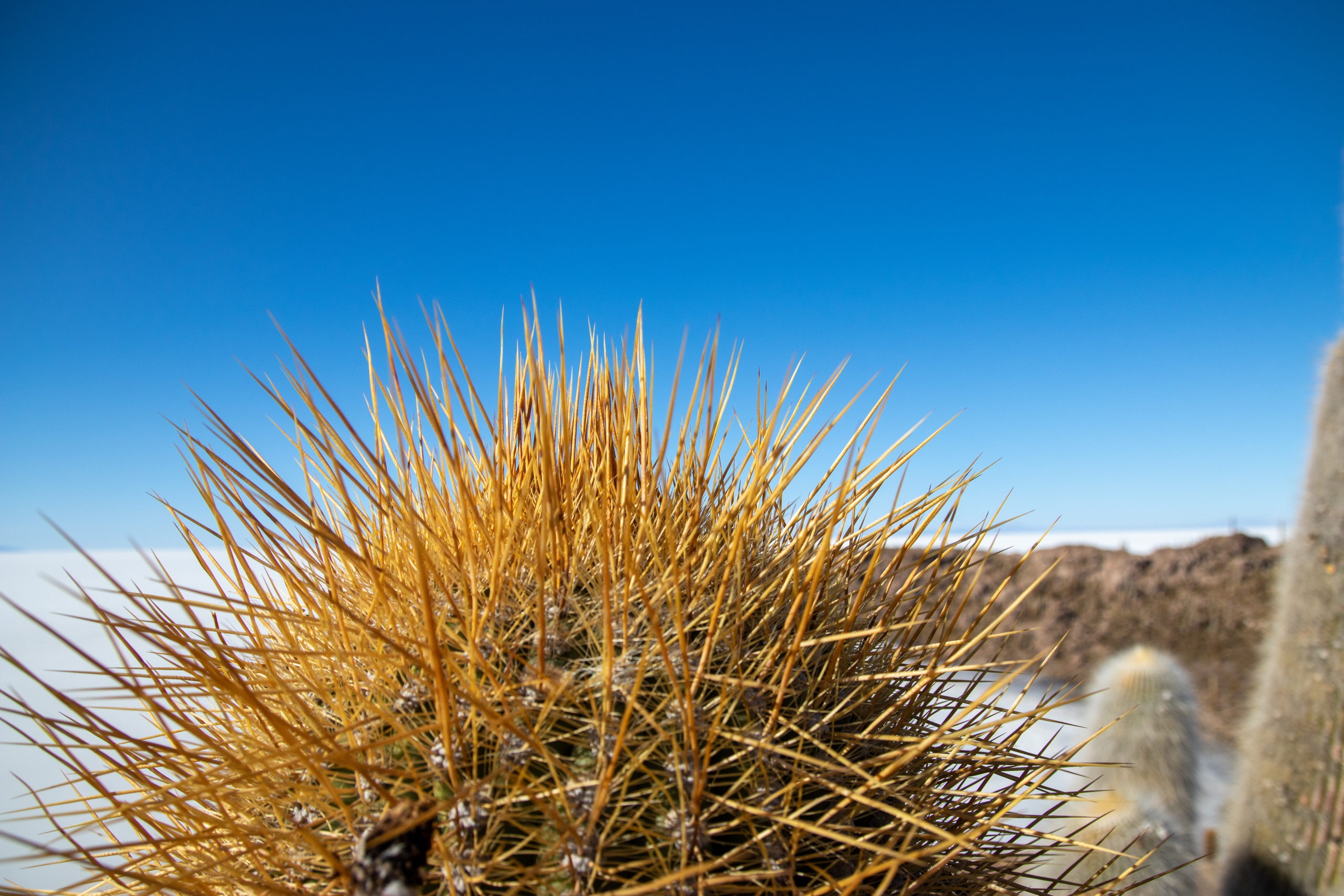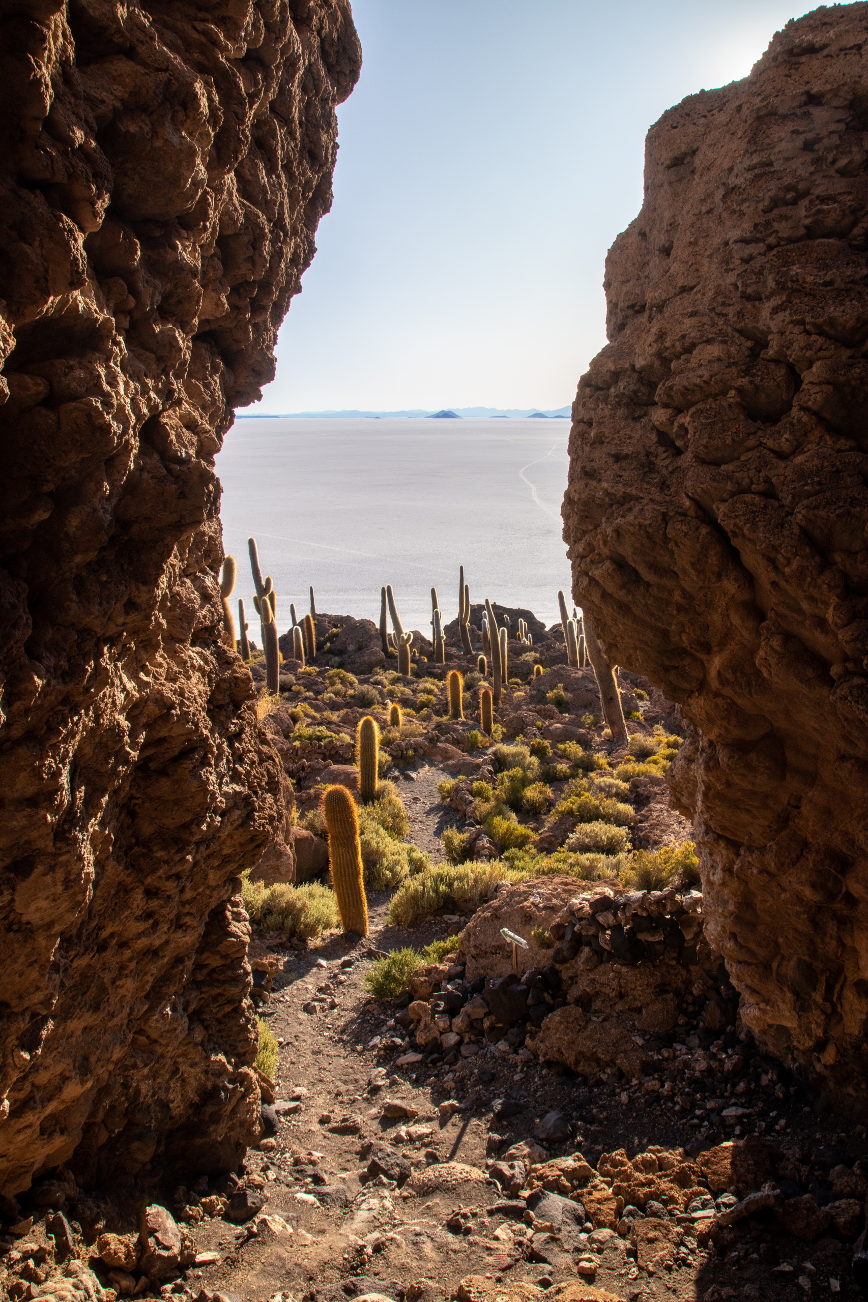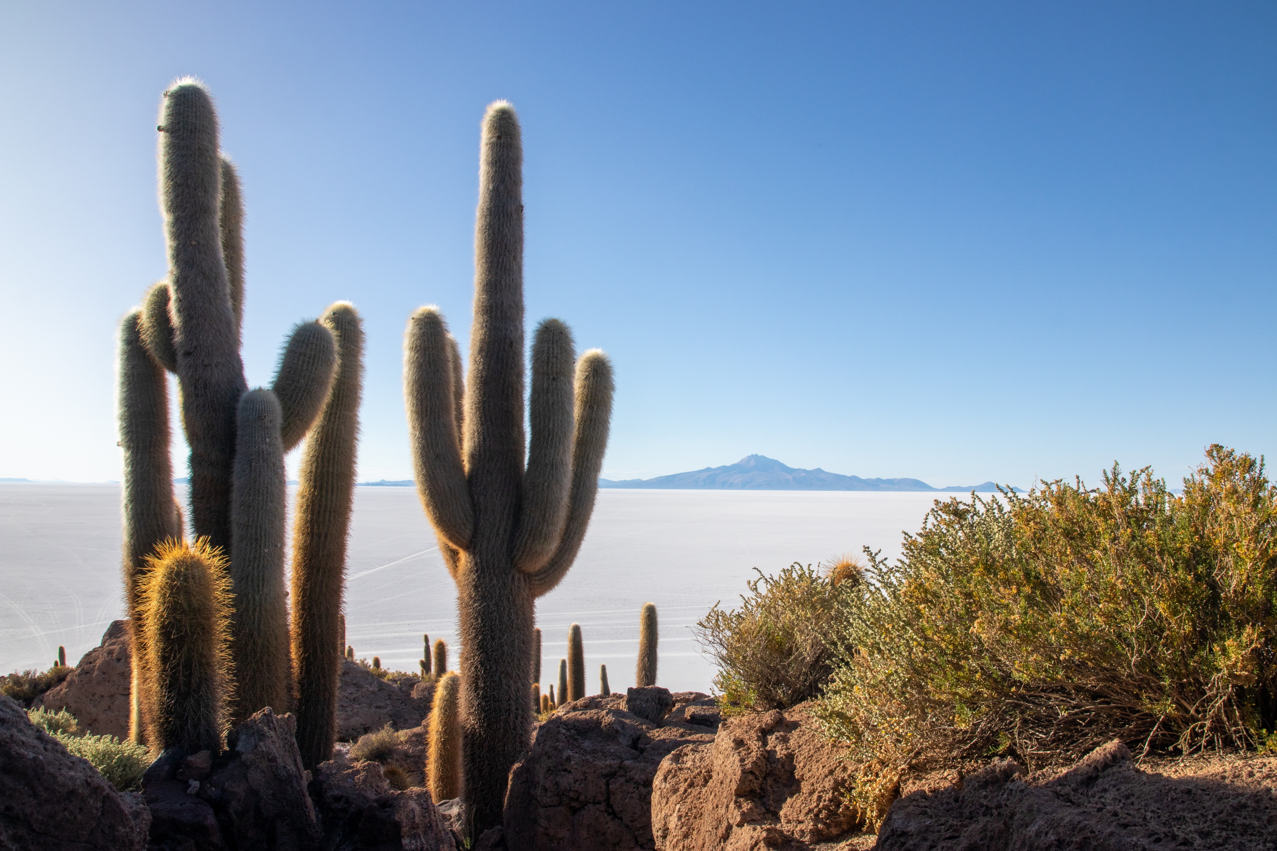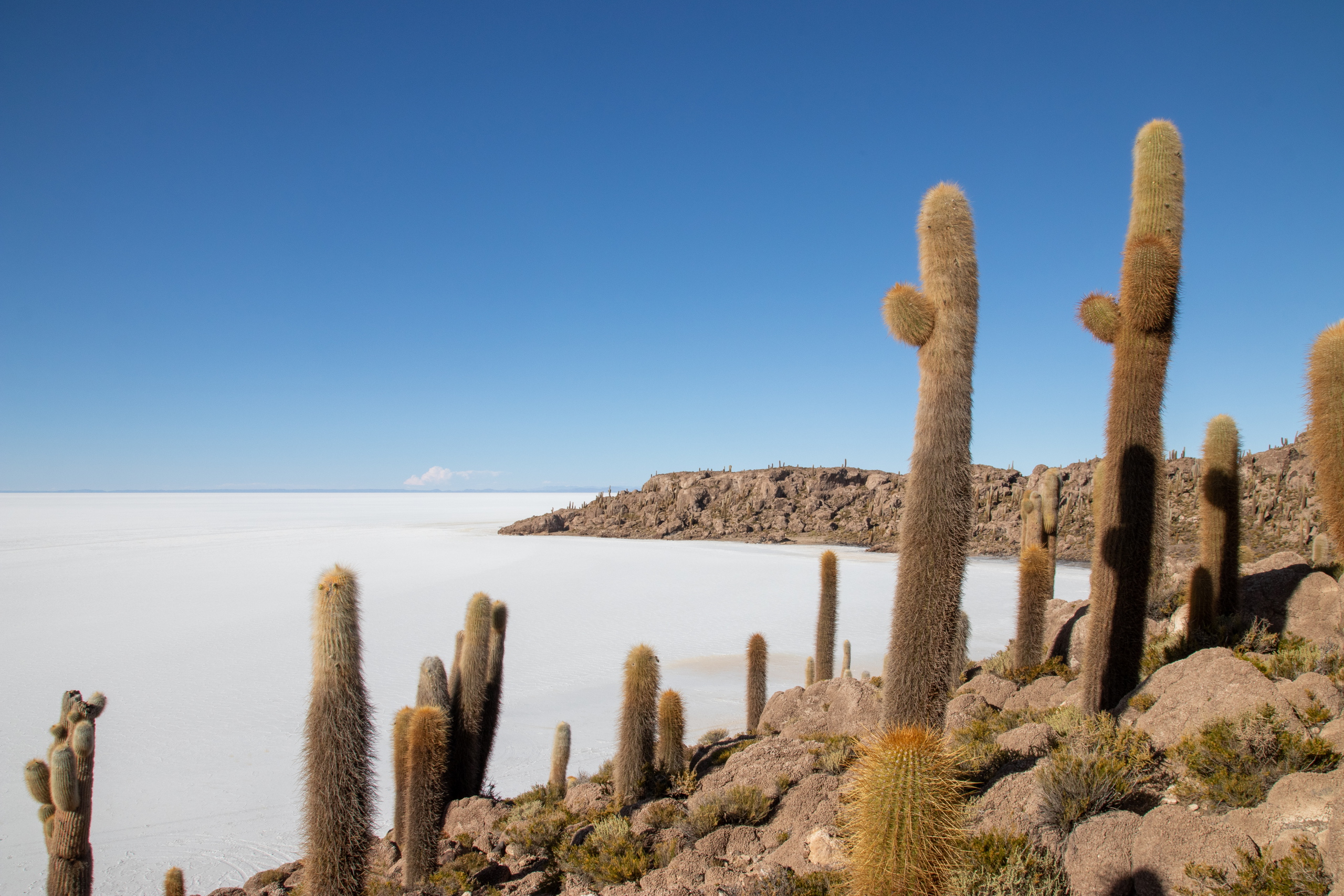 Mit 120 Sachen blasen wir in Richtung Isla Incahuasi. Mitten in der Salar hält unser Fahrer an. Wir sollen uns ein wenig die Gegend ansehen während er alles für das Mittagessen vorbereitet. Tisch, Sessel, Sonnenschirm und alles, was eben so dazu gehört. Ein Stück weiter machen wir die klassischen Fotos und die Bierflasche kommt zum Einsatz. Man kann klar erkennen, dass ich auf Bier stehe. 😁 Für die Isla Incahuasi ist diesmal auch etwas mehr Zeit und da ich vieles schon kenne, kann ich mich aufs Fotografieren konzentrieren.