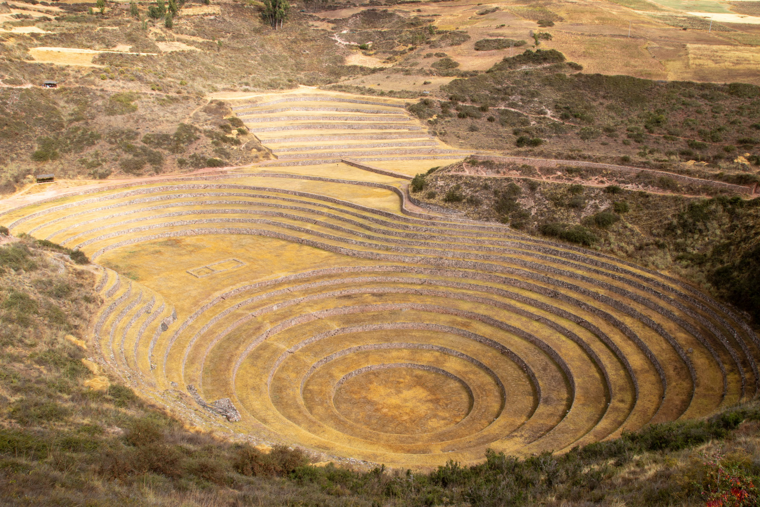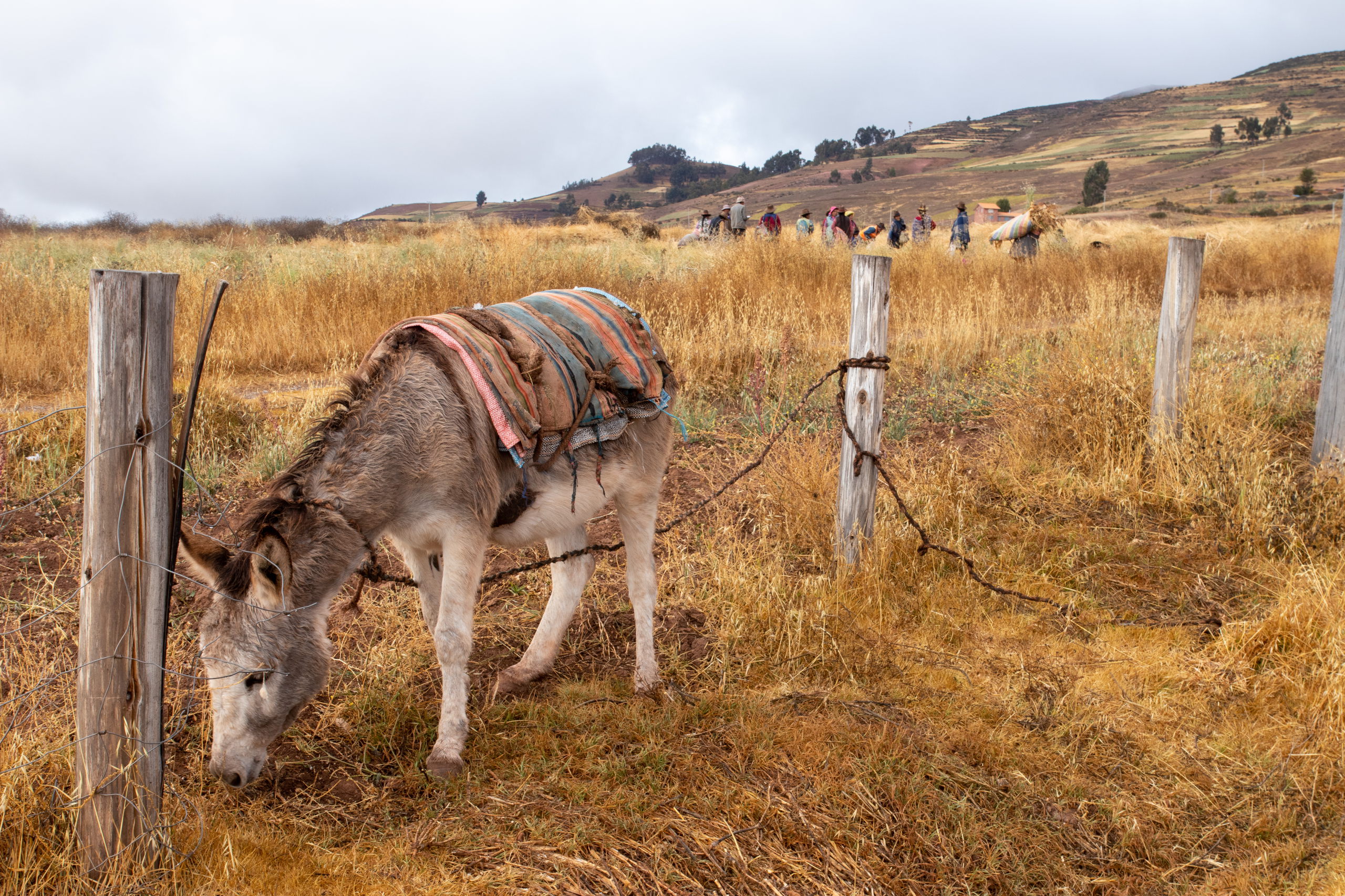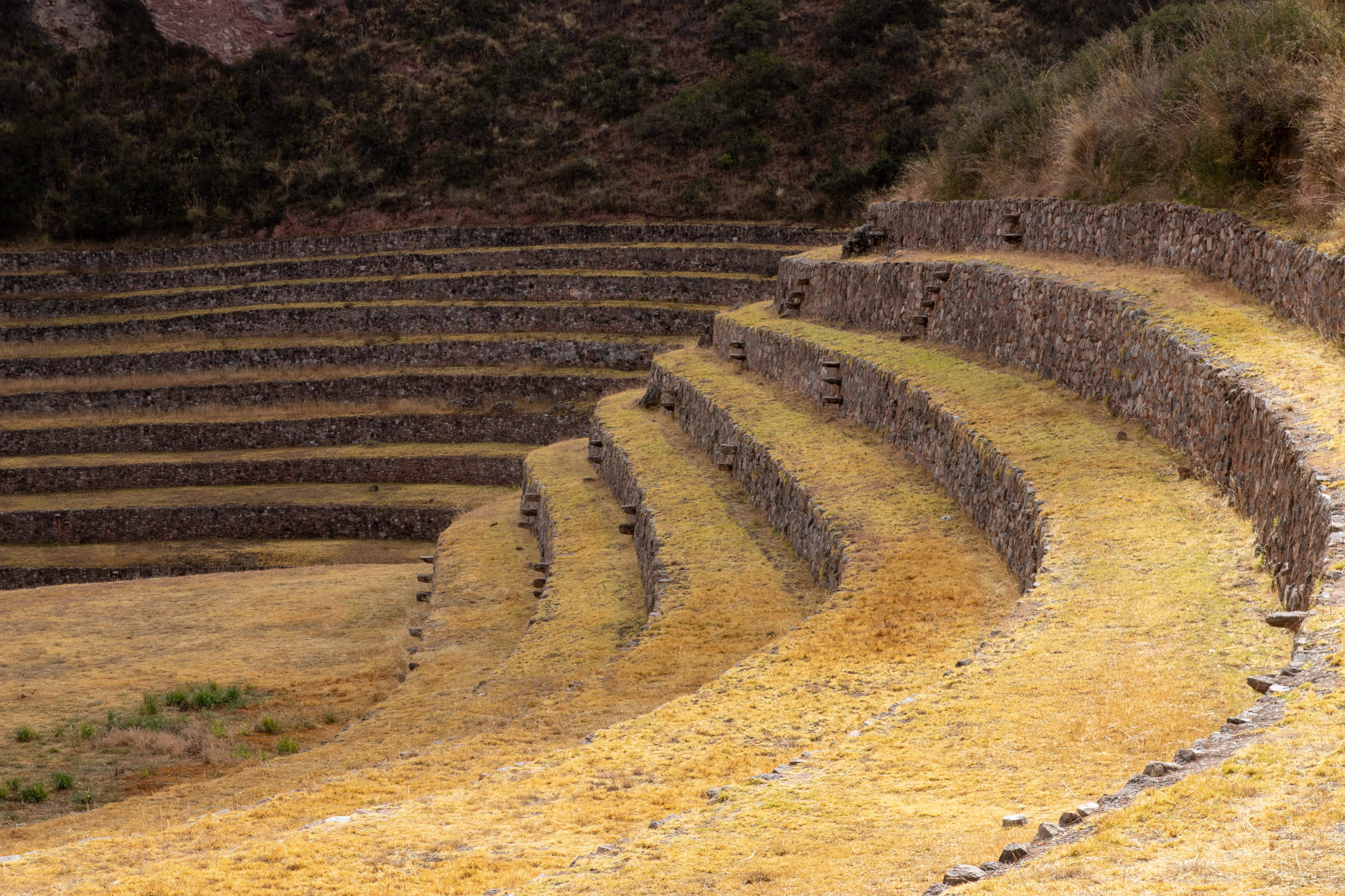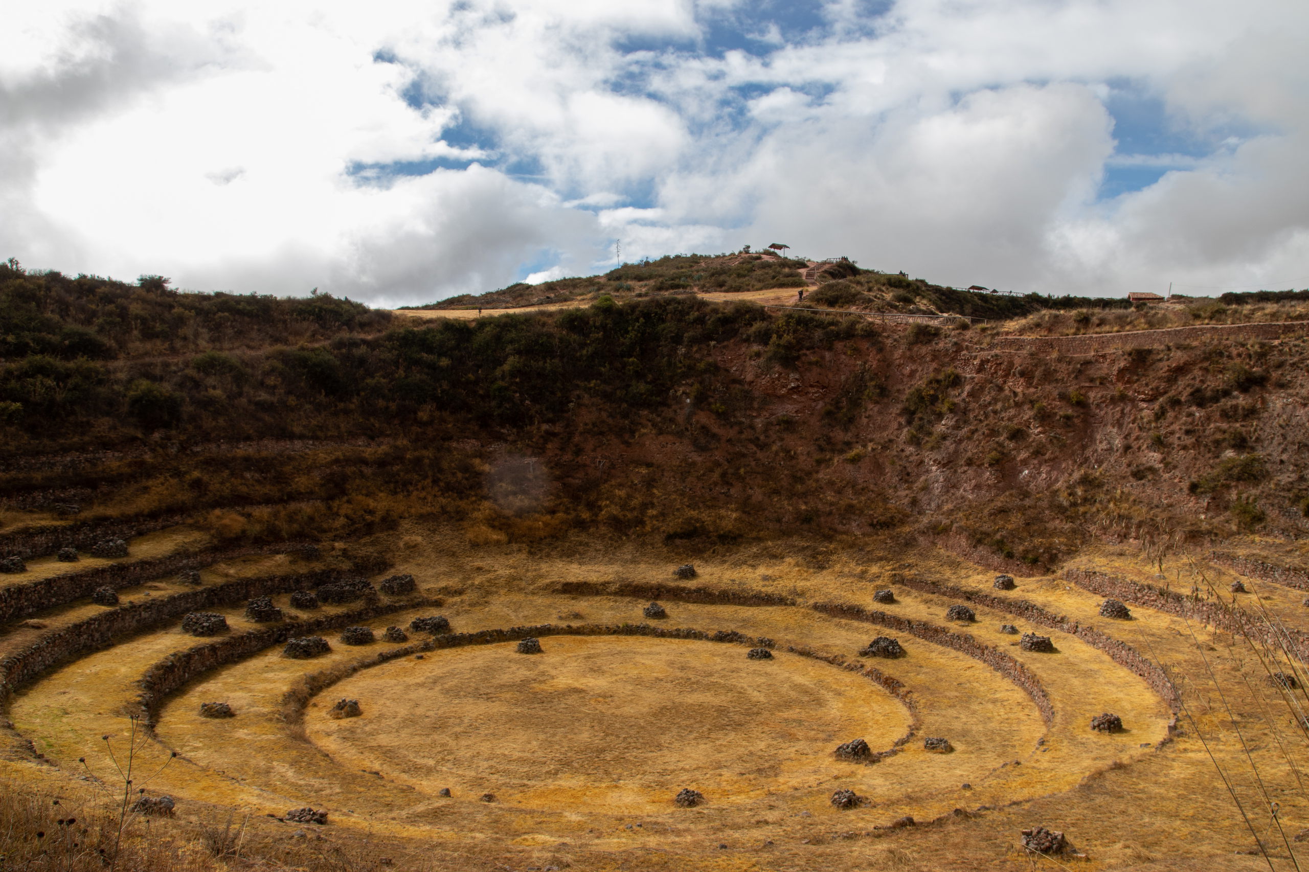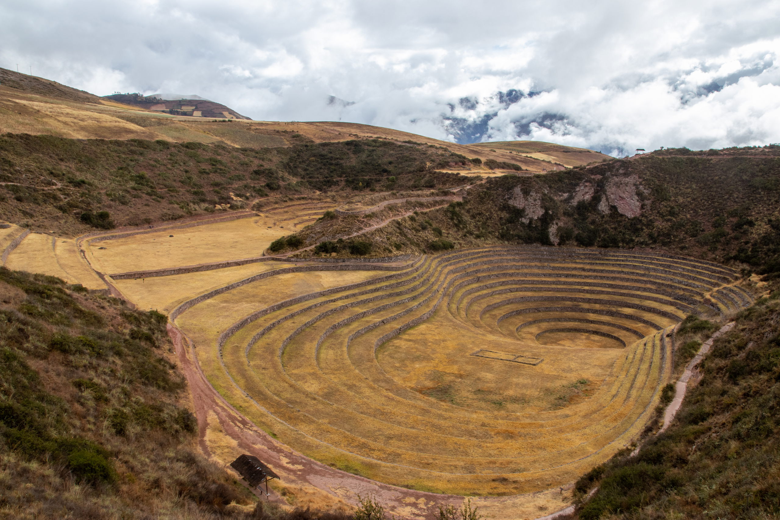 Um acht Uhr erreiche ich Moray, das Agrarlabor der Inka. Hier wurden früher unterschiedliche Anbaumöglichkeiten und Pflanzen auf kreisförmigen Terrassen ausprobiert. Ich gehe hinunter und schreibe etwas für den Blog, während ich den Regen abwarte. Als die ersten Gruppen ankommen setze ich meine Runde fort. Es ist trocken und etwas später kommt tatsächlich die Sonne raus. Ich schwächle etwas und gehe auf einen Choclo con Queso. Schmeckt sehr gut und die riesigen Körner geben Kraft.