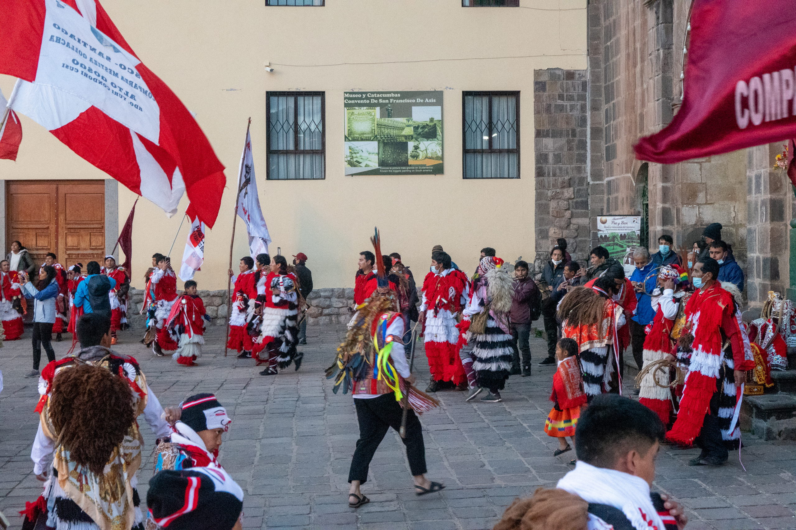 Ich bin ziemlich KO und beschließe die Wanderung nicht zu machen, zumal die Fotos nicht so toll aussehen und der Ort gerade eine Baustelle ist. Mit einem anderen Colectivo geht es in einer dreiviertel Stunde zurück nach Cusco. Im Mercado San Pedro besorge ich Obst und Brot und gehe auf den obligatorischen Schokopudding. Am Eingang der Iglesia de San Francisco tanzt eine geschmückte Gruppe Männer. Im Juni findet fast jeden Tag ein anderes Fest statt. Das größte ist das Inti Raymi, bei dem der Sonnengott verehrt wird. Leider bin ich da schon weiter im Norden. Zurück im Zimmer recherchiere ich für Afrika und schlafe bald ein.