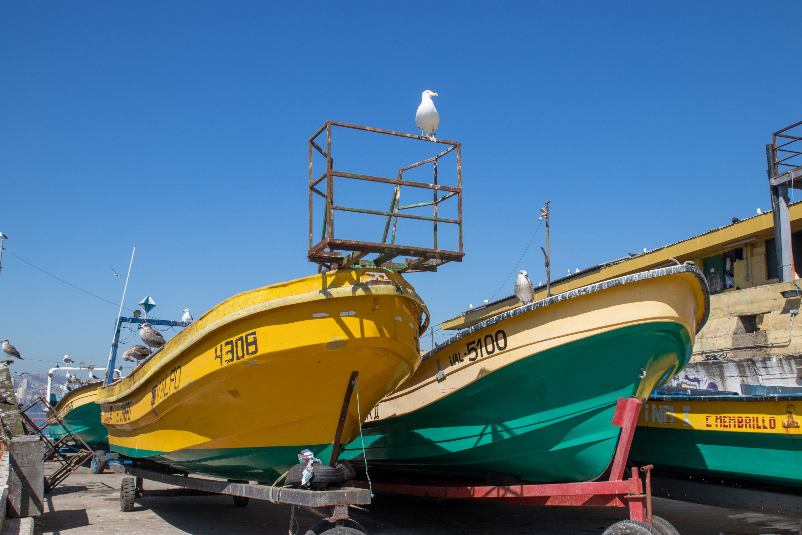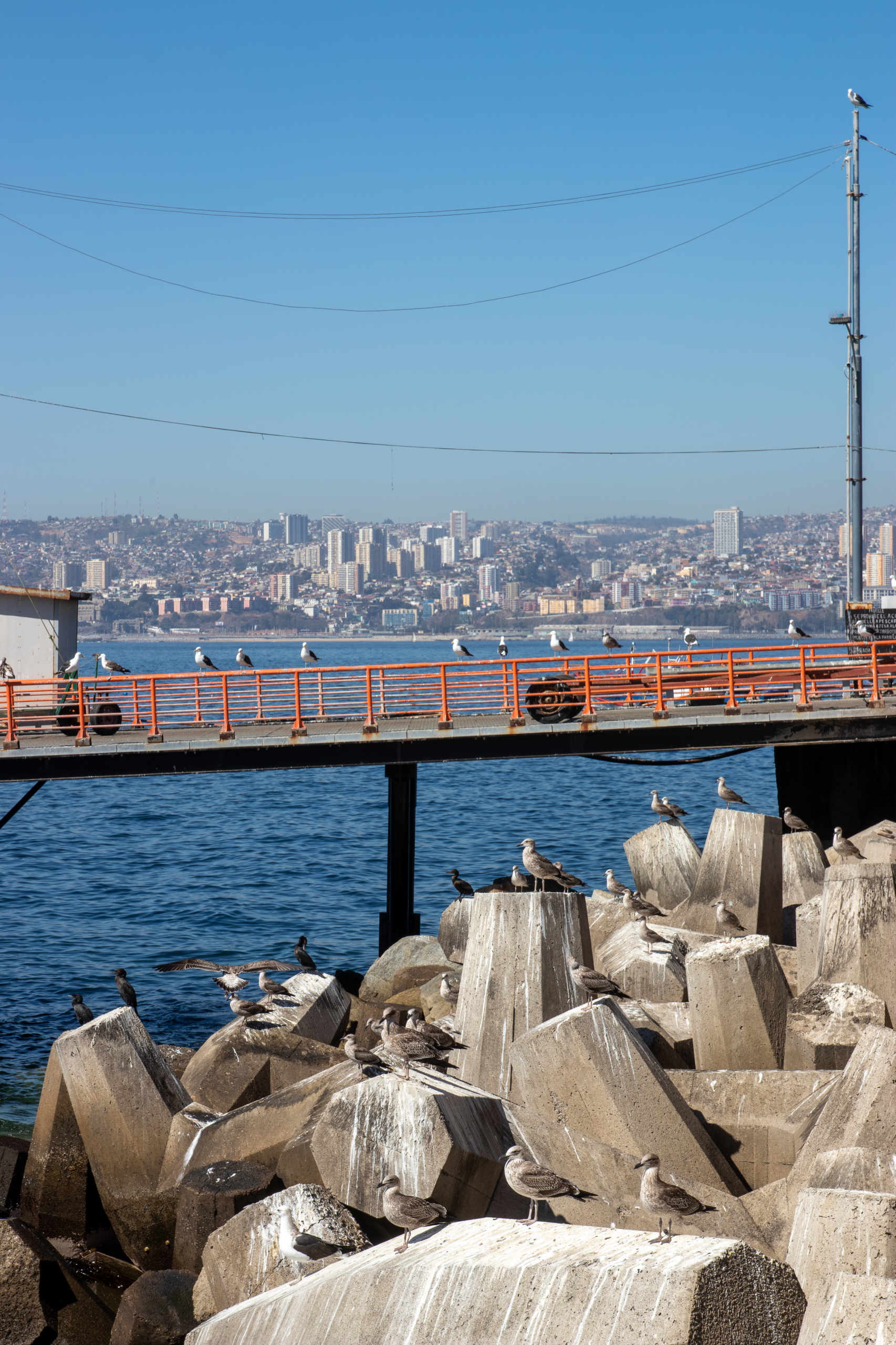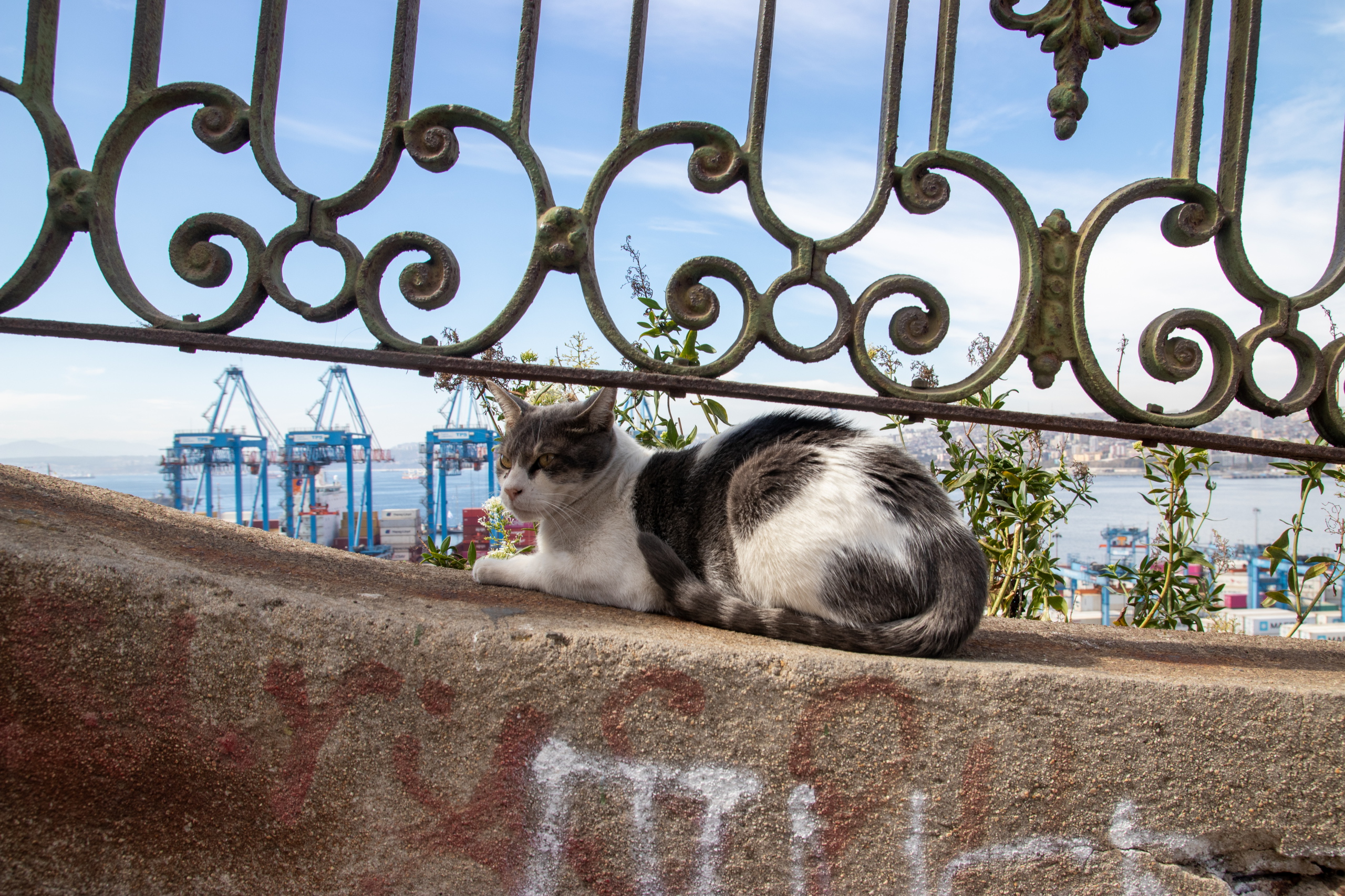 Marco, ein Anhalter von der Carretera Austral der in Valparaiso lebt, hat mir einen Rundgang mit vielen Sehenswürdigkeiten zusammengestellt. Voll nett. Gegen Mittag mache ich mich auf den Weg und ich komme vorbei am Paseo Reina Victoria am Cerro Alegre, von dort weiter zum Mirador Atkinson und Gervasoni am Cerro Concepcion und weiter zum Paseo Yugoslavo in Cerro Alegre. Insgesamt gibt es 42 Cerros in Valparaiso, eine kleine Auswahl muss reichen. Zweimal werde ich von Einheimischen darauf hingewiesen, dass ich auf meine Kamera aufpassen soll. Ahja, wieder in einer Großstadt angekommen. Von oben kann ich riesige, alte Segelschiffe an der Mole sehen. Da gehe ich später auch noch hin! Ich komme zum Plaza Sotomayor und gehe hinauf zum Paseo 21 de Mayo am Cerro Artillería, wo auch das Museo Maritimo Nacional ist. Es gibt jede Menge Katzen hier. Klaro. Hafen, Meer, Fische, Katzen.