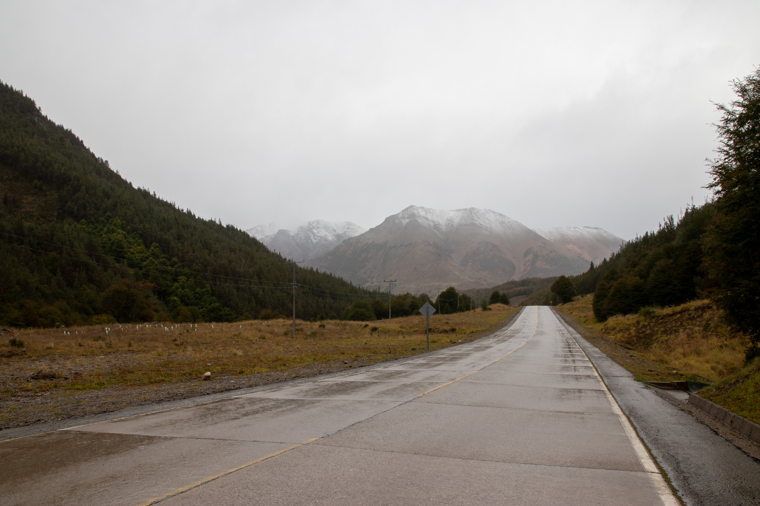 Der Tag startet um neun Uhr mit einem köstlichen Frühstück. Elena, Lucas, ein anderer Gast und ich unterhalten uns lange und genießen das Frühstück. Das Wetter ist bescheiden und ich erledige noch einiges am Laptop, bevor ich mich gegen Mittag auf den Weg nach Puerto Aysen mache. Hier tanke ich voll und drehe eine kleine Runde. Auf der weiteren Fahrt ist ziemlich wenig Verkehr. Die Saison geht dem Ende zu. Ich komme wieder zu der Baustelle am Pass und auch heute sind wieder einige Schleicher unterwegs. Am höchsten Punkt der Straße beginnt es etwas zu graupeln. Der Winter klopft an. Nach der Baustelle warte ich eine Weile, damit die Schleicher etwas Vorsprung haben und ich in sportlicherem Tempo die Serpentinen hinunter fahren kann. Das macht Spaß, wenn auch nur kurz, da die nächste Baustelle schon wartet.