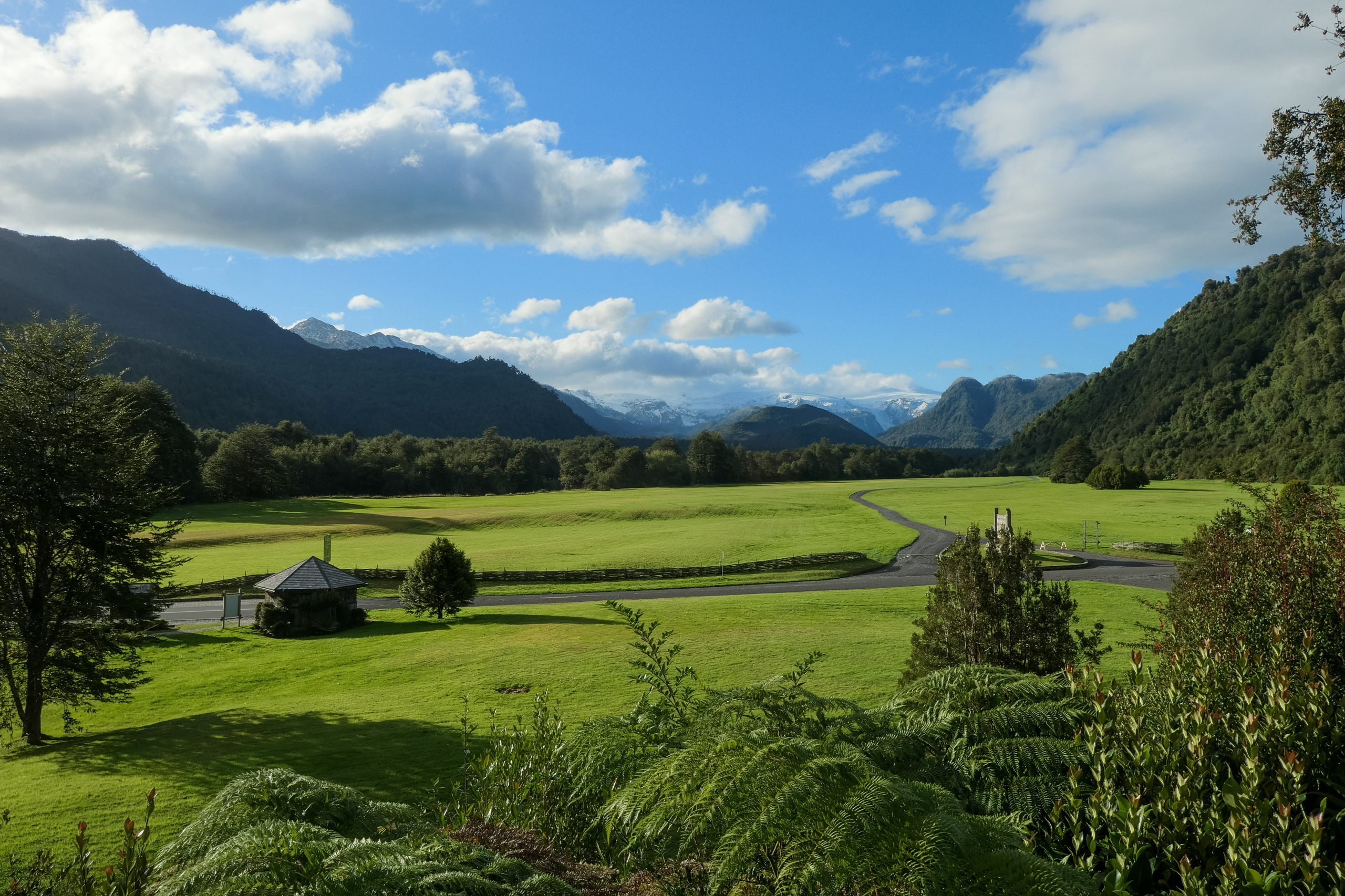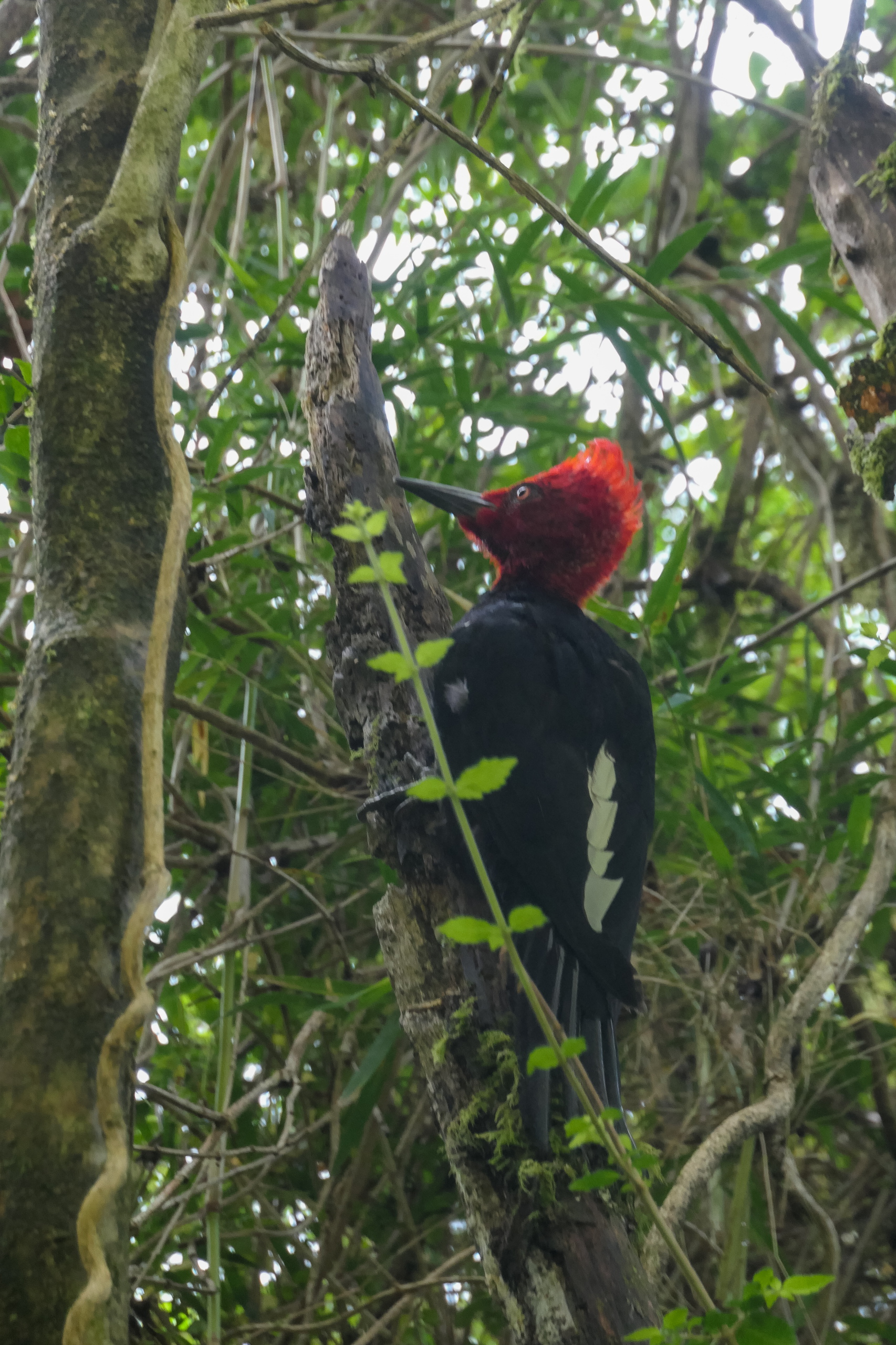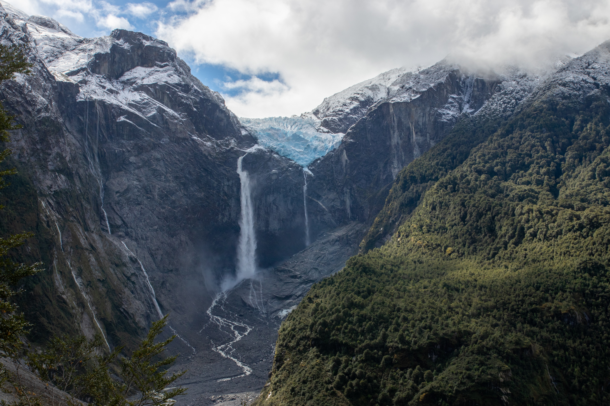 Gegen Mittag starten wir gemeinsam los. Zuerst geht es über eine Hängebrücke und dann im Urwald hoch. Der Weg ist relativ feucht und an einer Stelle mehr Bach als Weg. Eigentlich nicht schwierig, aber man muss schon etwas aufpassen um nicht auf den feuchten Wurzeln auszurutschen, oder im Matsch zu versinken. Der Blick zum Gletscher und zum Wasserfall ist sehr schön, für die Kamera sind die hohen Kontraste jedoch eine große Herausforderung. Ich brauche lange, um ein halbwegs brauchbares Foto zu machen. Den anderen mit den Handys ist das egal. Posen, abdrücken, fertig. Wir warten ca. eine halbe Stunde, in der Hoffnung, dass sich die Wolken verziehen. Der Plan geht leider nicht auf und so machen wir uns an den Abstieg. Ich höre ein Geräusch, das ich aus El Chaltén kenne und sehe mich etwas um. Der Verursacher ist schnell ausgemacht. Eine Magellanspecht, der nicht gerade scheu vor sich hin pickt. Nach insgesamt zweieinhalb Stunden sind wir wieder beim Auto und fahren zurück. An der Kreuzung zur Hauptstraße stehen zwei junge Tramper. Bitte einsteigen. Zurück in Puyuhuapi liefere ich das deutsch Pärchen an ihrem Campingplatz ab. Die beiden Chilenen, Marco und Carlos, wollen weiter nach Chaitén. Eigentlich wollte ich auf dieser Strecke alleine und in Ruhe fahren, aber warum nicht. Ihnen ist geholfen und ich kann etwas Spanisch üben. Und es gibt Karmapunkte für das Mitnehmen von Trampern. 😁