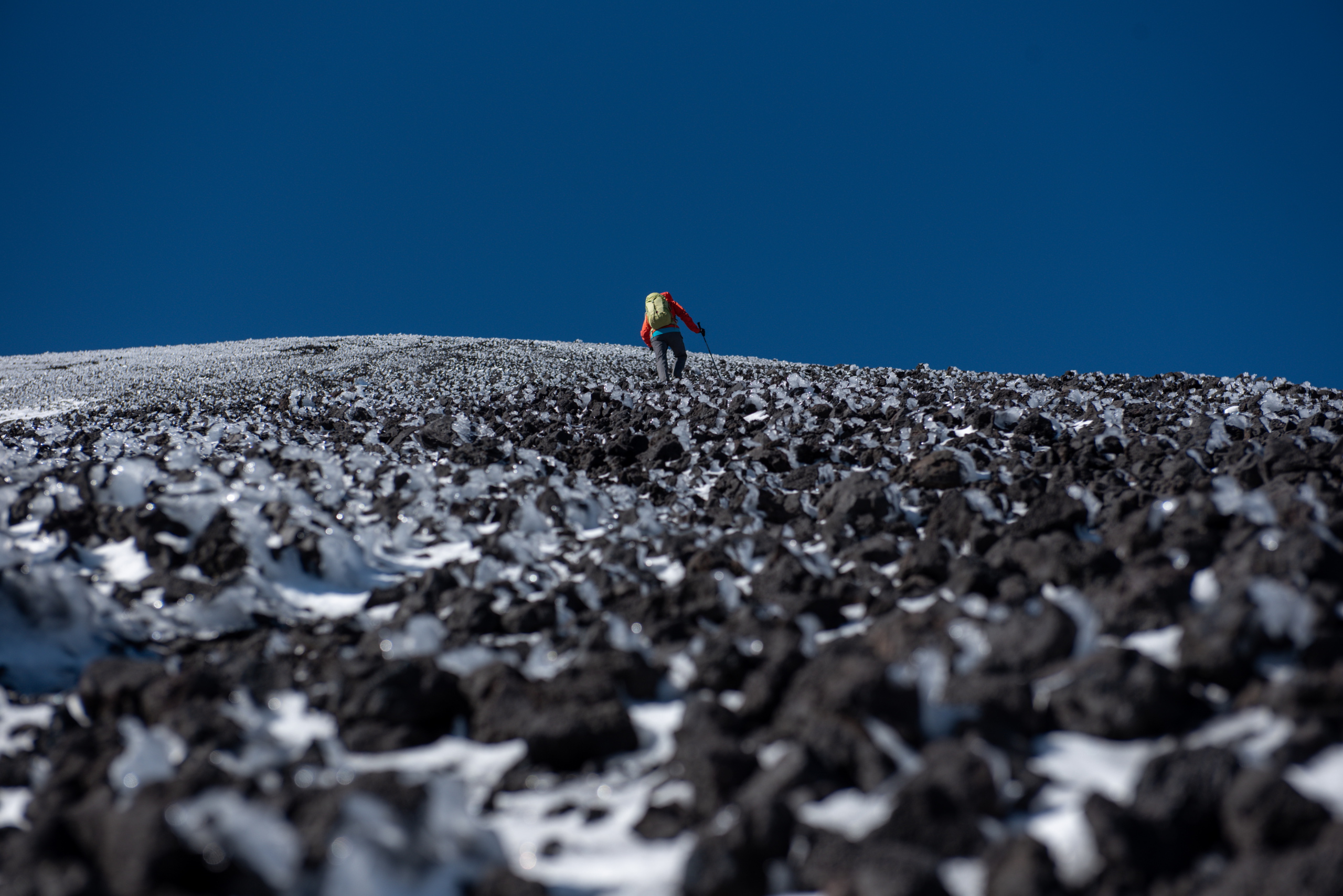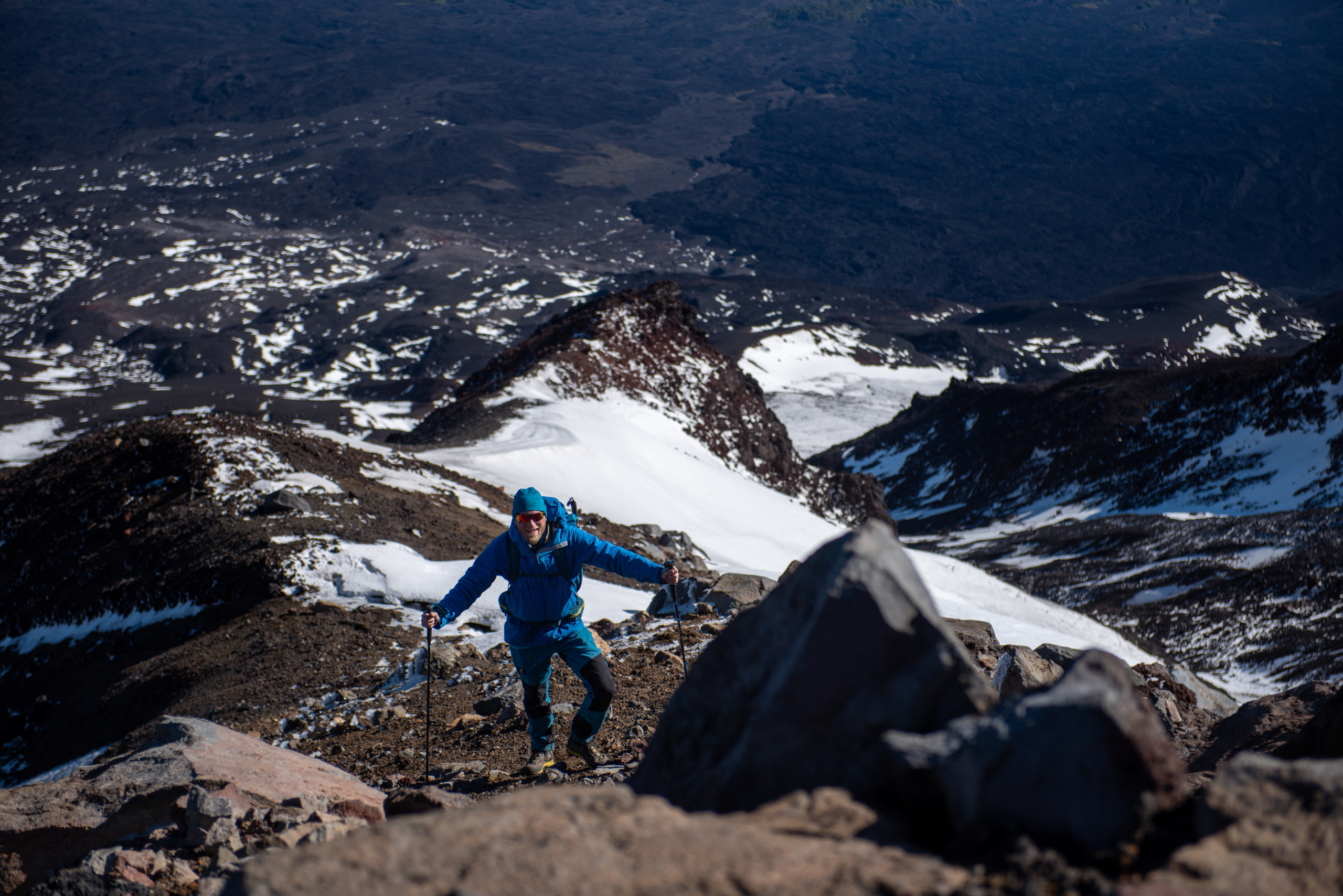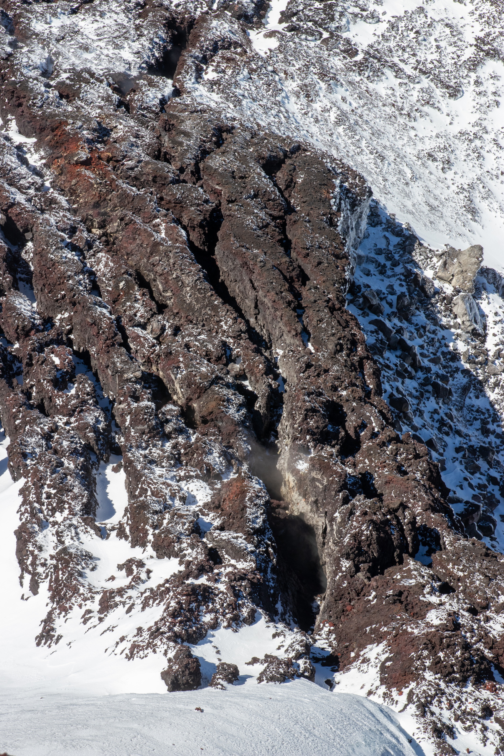 Tagwache ist um sechs Uhr. Nach einem schnellen Frühstück haben wir nach einer Dreiviertelstunde unser Zeug zusammen und gehen los. Zuerst steil die apere Skipiste hinauf und dann ein langes Stück in leichtem Anstieg über ein Lavafeld bis zum Fuße des Vulkankegels. Die Sonne kommt heraus und wir machen eine kurze Pause. Mühselig geht es über steiles und rutschiges Gelände hoch, bis der Weg einfacher über Felsen weitergeht. Ein Grat führt erst einfach, dann mühsam in losem Schotter aufwärts. An zwei Stellen muss etwas mit den Händen mitgeholfen werden. Der letzte Abschnitt besteht aus fest zusammen gefrorenen Steinen, die an einer Seite mit Eis überzogen sind. Erstaunlicherweise halten die Tritte sehr gut.