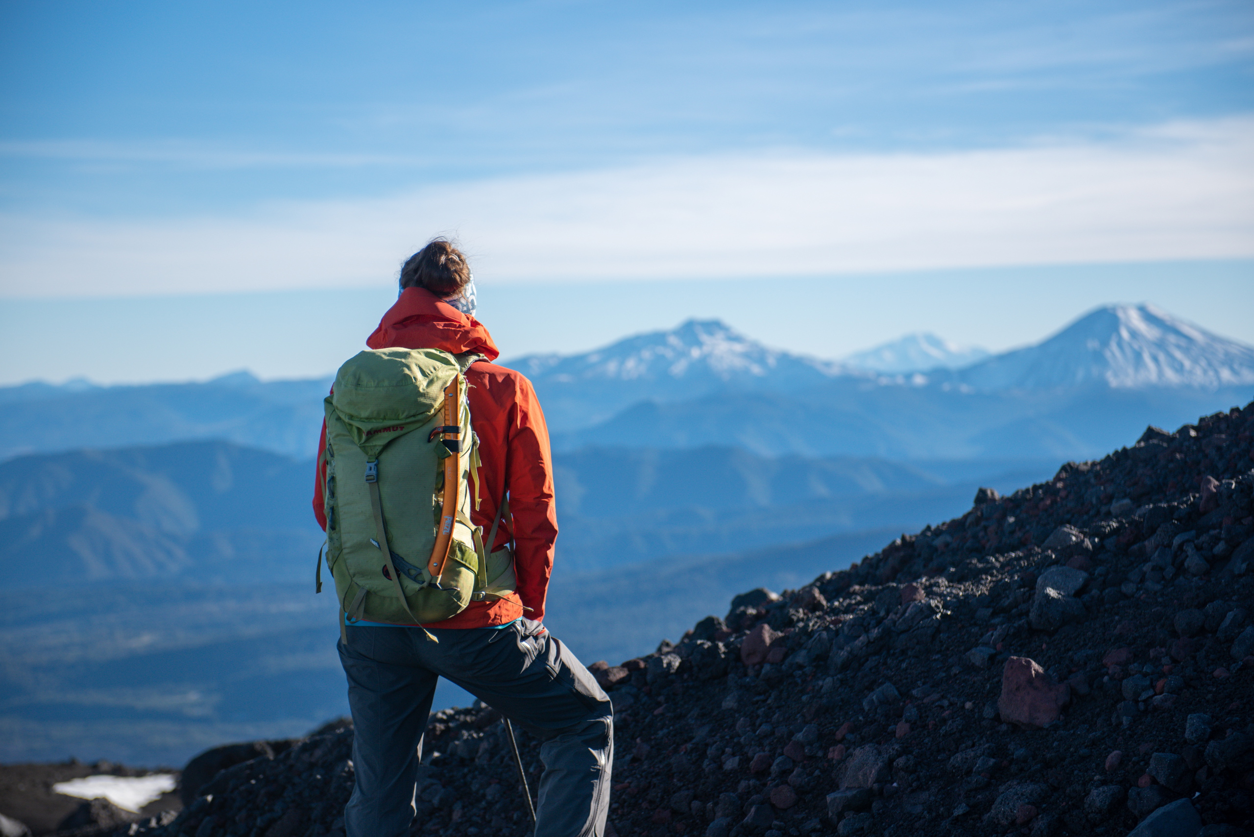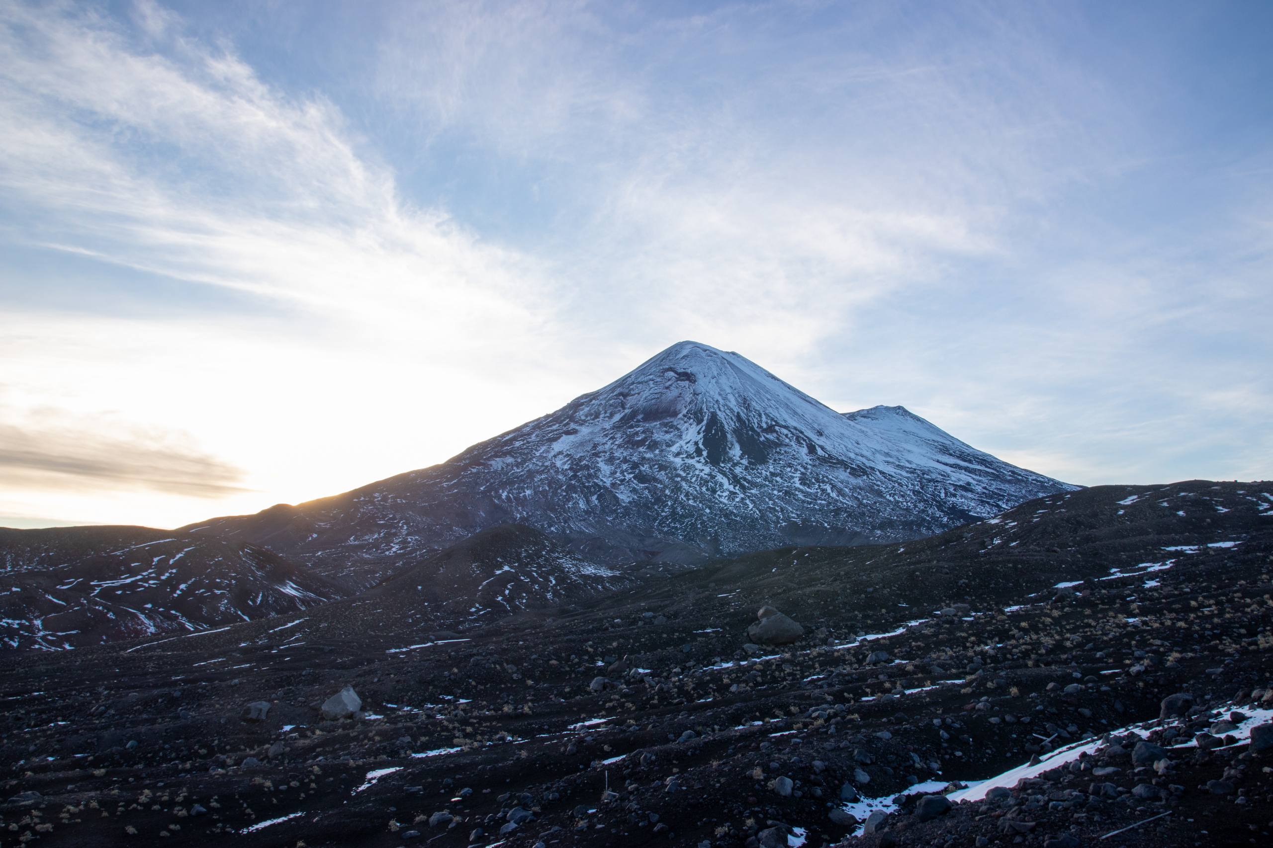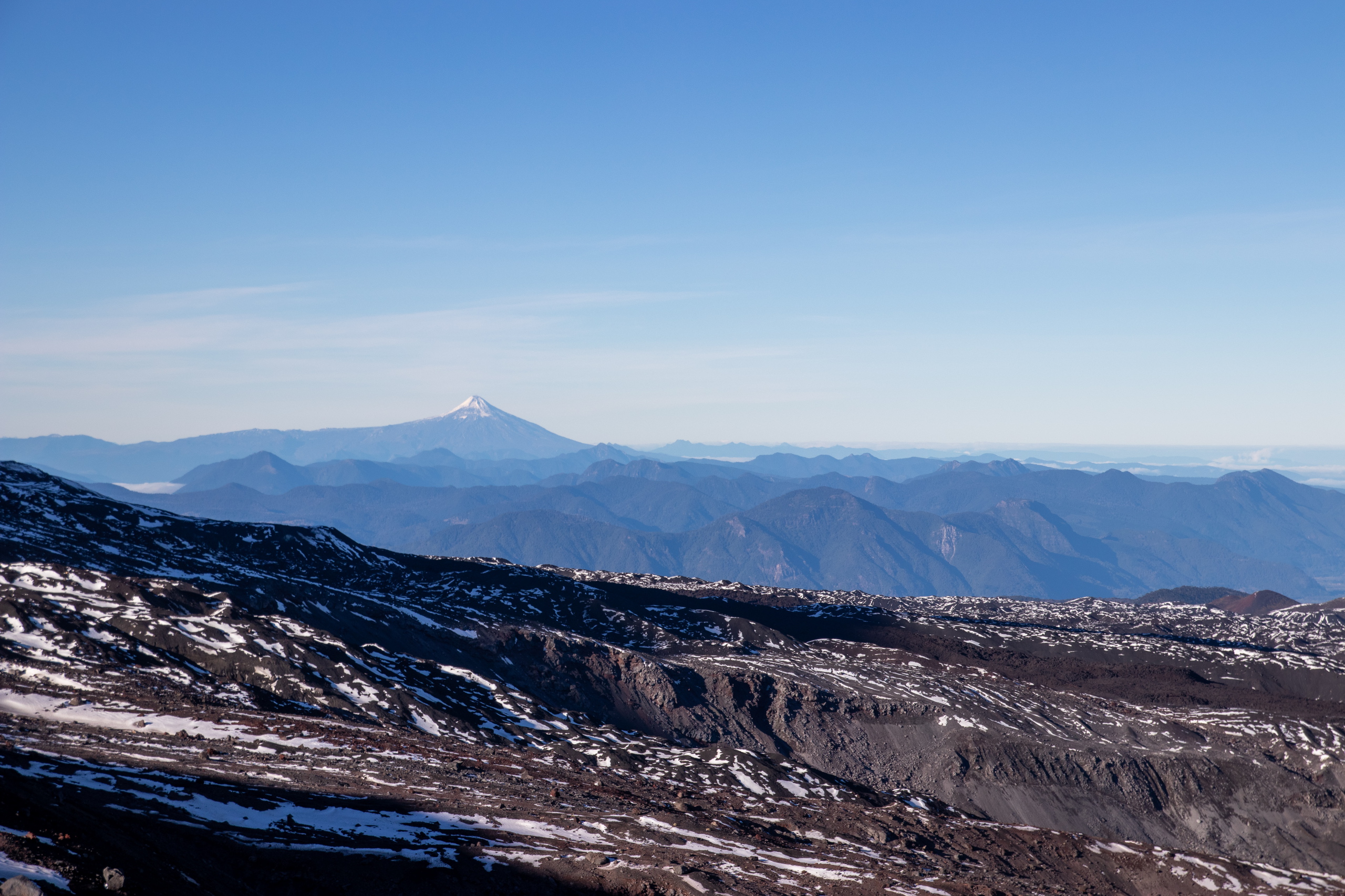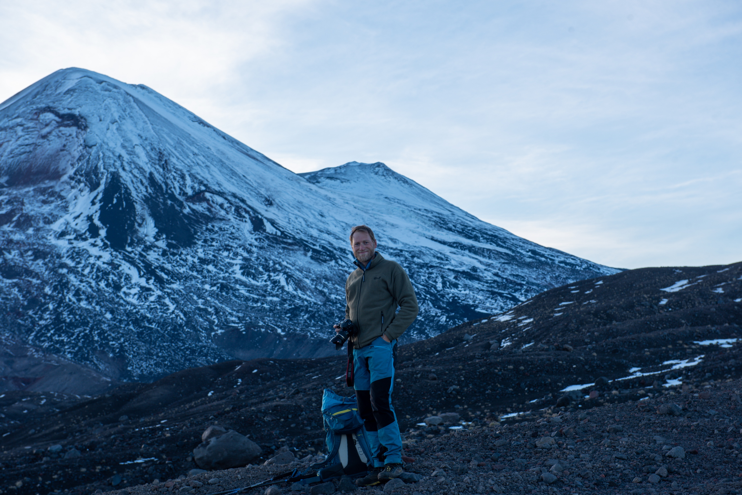 Tagwache ist um sechs Uhr. Nach einem schnellen Frühstück haben wir nach einer Dreiviertelstunde unser Zeug zusammen und gehen los. Zuerst steil die apere Skipiste hinauf und dann ein langes Stück in leichtem Anstieg über ein Lavafeld bis zum Fuße des Vulkankegels. Die Sonne kommt heraus und wir machen eine kurze Pause. Mühselig geht es über steiles und rutschiges Gelände hoch, bis der Weg einfacher über Felsen weitergeht. Ein Grat führt erst einfach, dann mühsam in losem Schotter aufwärts. An zwei Stellen muss etwas mit den Händen mitgeholfen werden. Der letzte Abschnitt besteht aus fest zusammen gefrorenen Steinen, die an einer Seite mit Eis überzogen sind. Erstaunlicherweise halten die Tritte sehr gut.