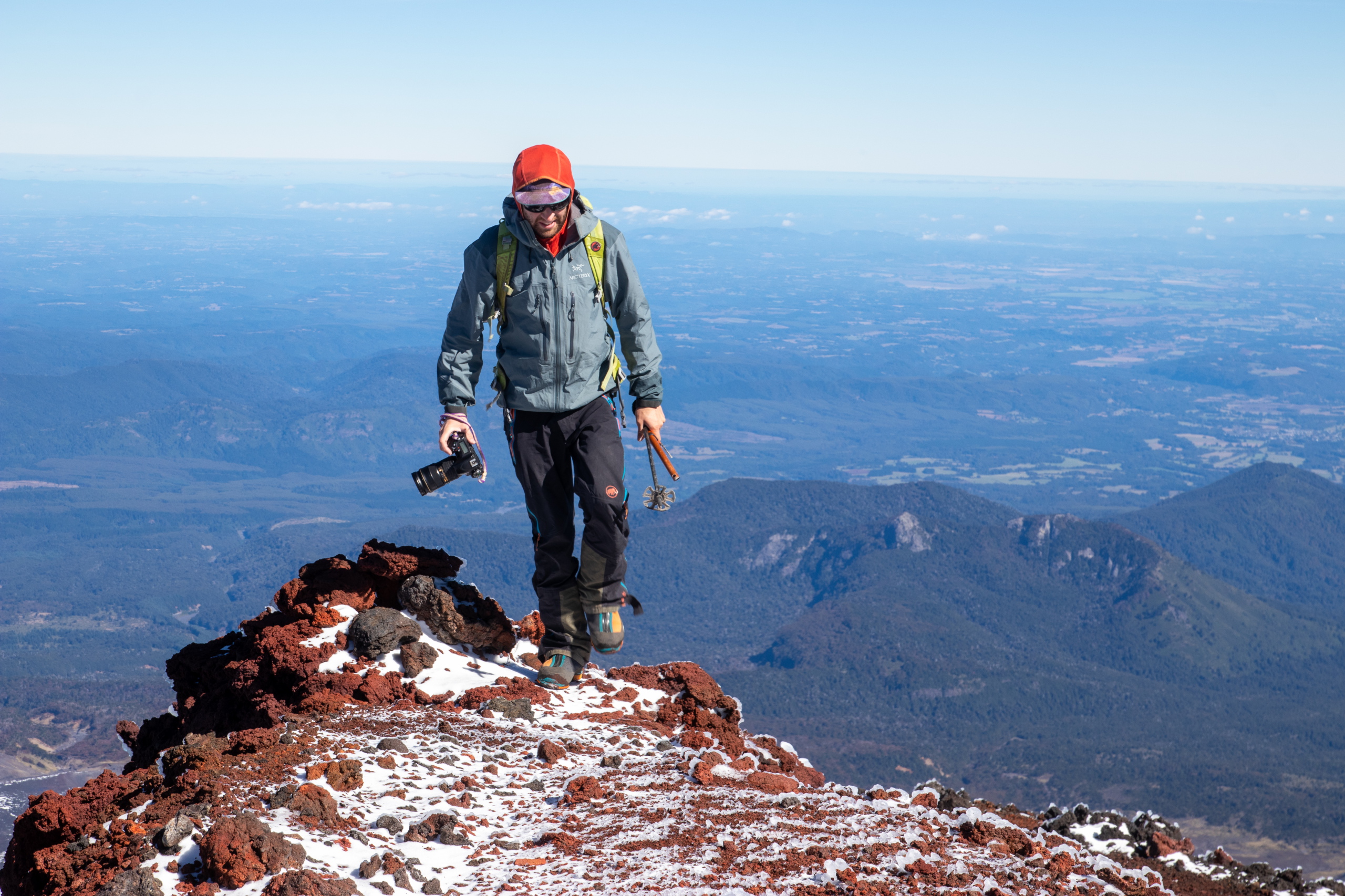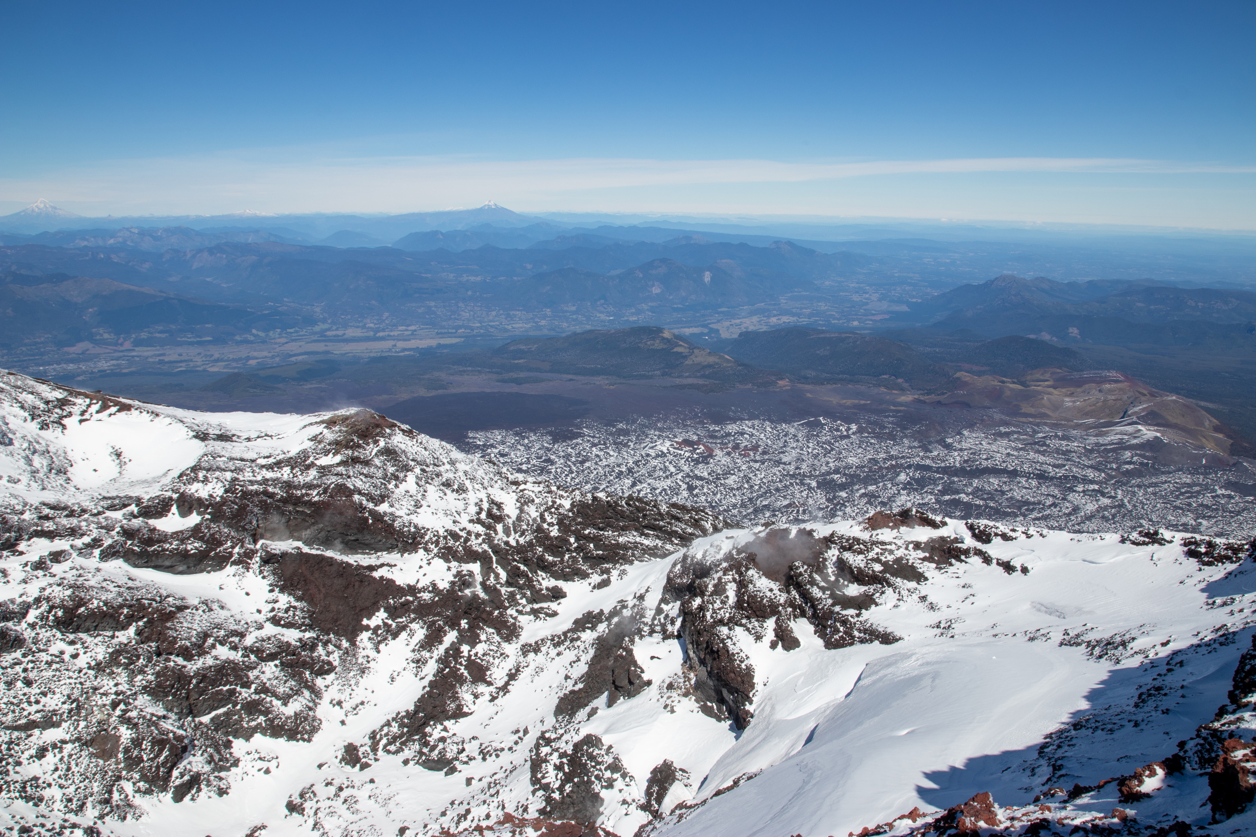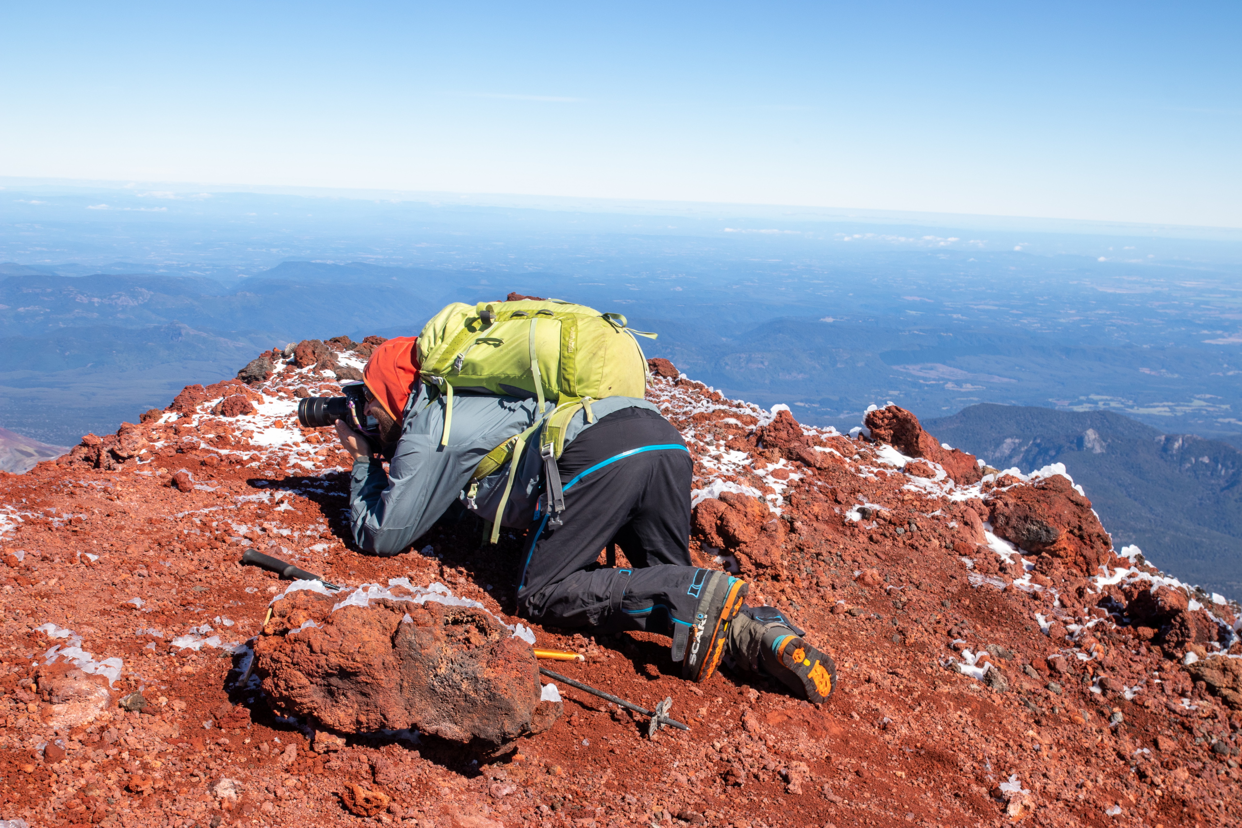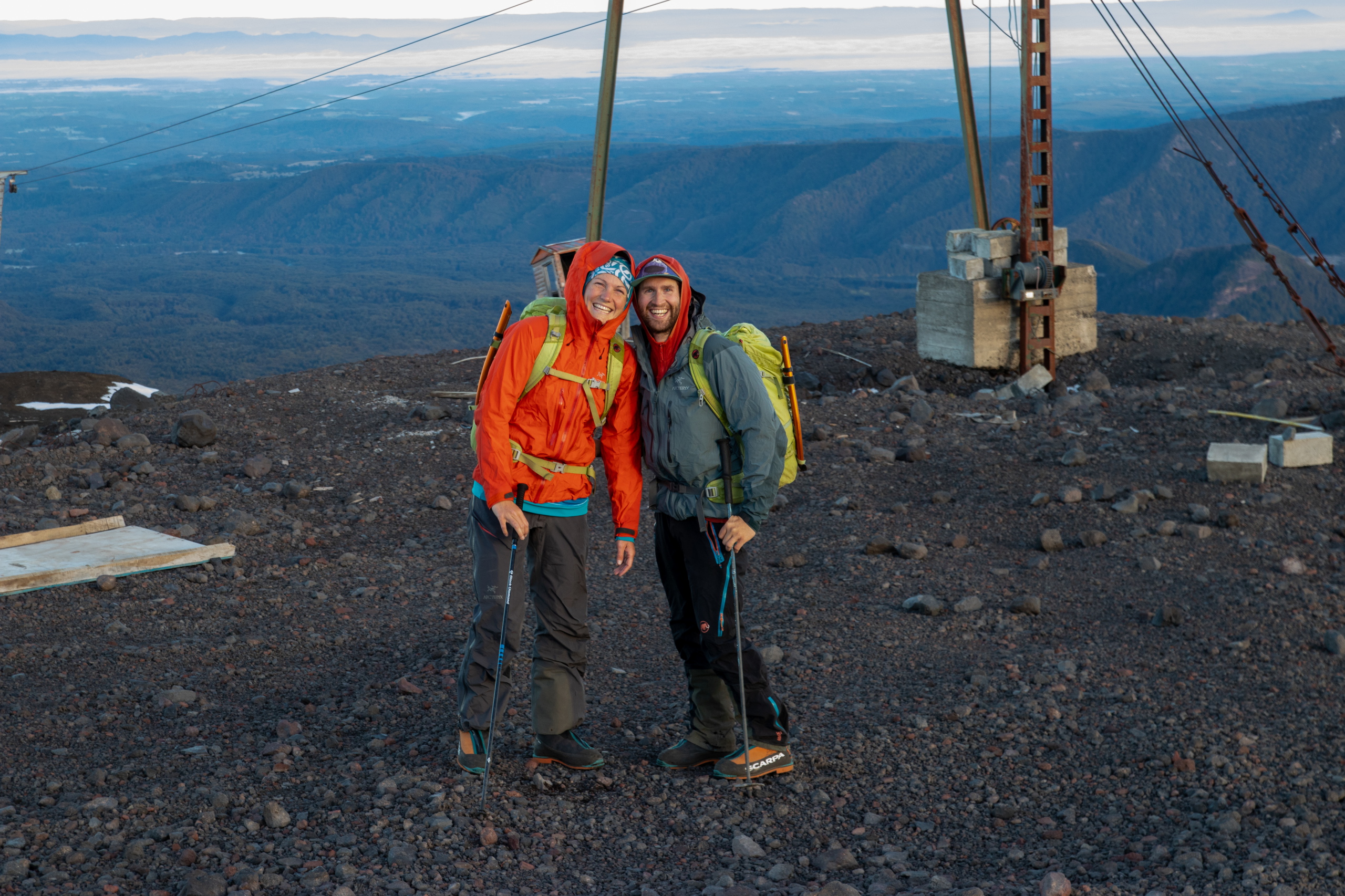 Nach fünfeinhalb Stunden sind wir am Gipfel mit herrlichem Rundumblick auf die umliegenden Berge und Vulkane. Für die Gipfeljause suchen wir uns ein windgeschütztes Plätzen und genießen die Aussicht bis zu den Bergen an der Küste. Birgit und Klemens suchen die Gipfel, die sie schon bestiegen haben. Gar nicht mal so wenige.
