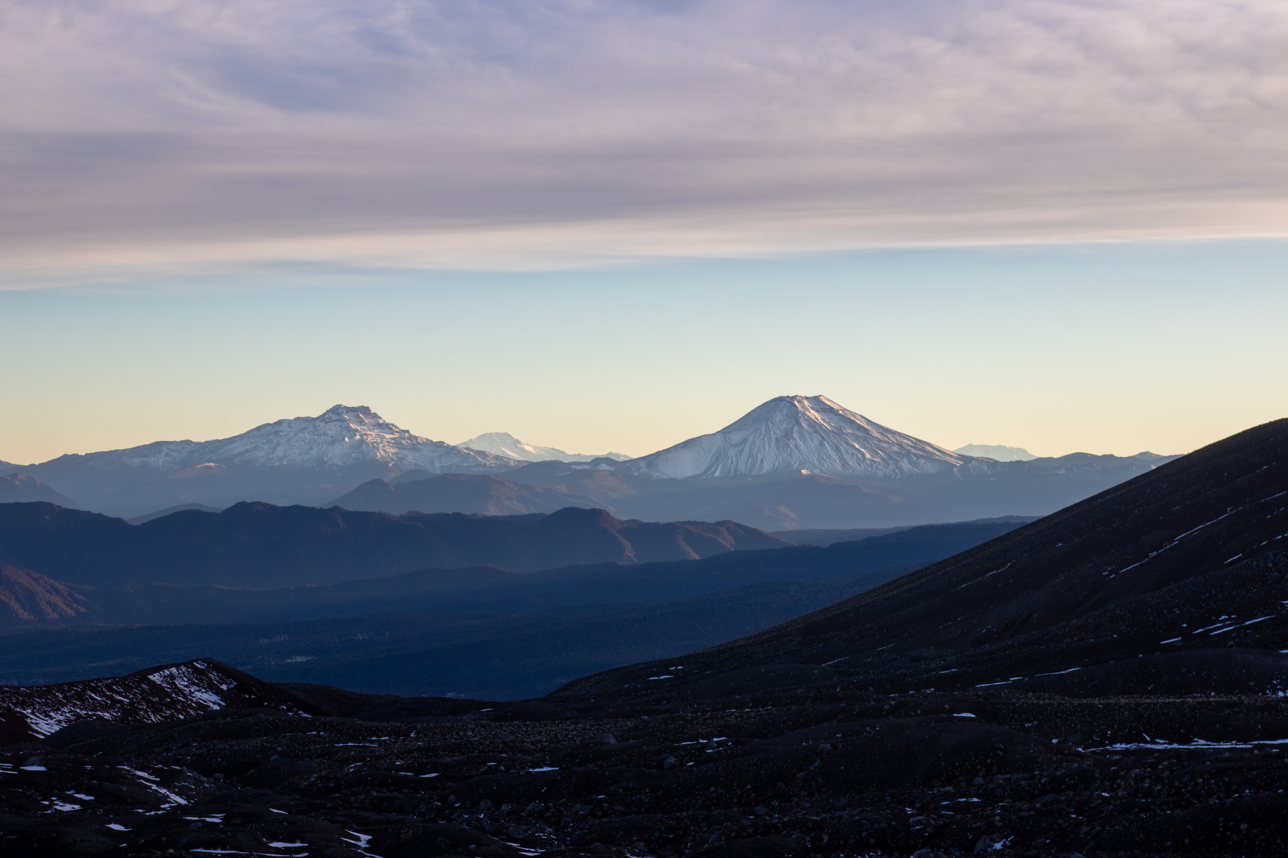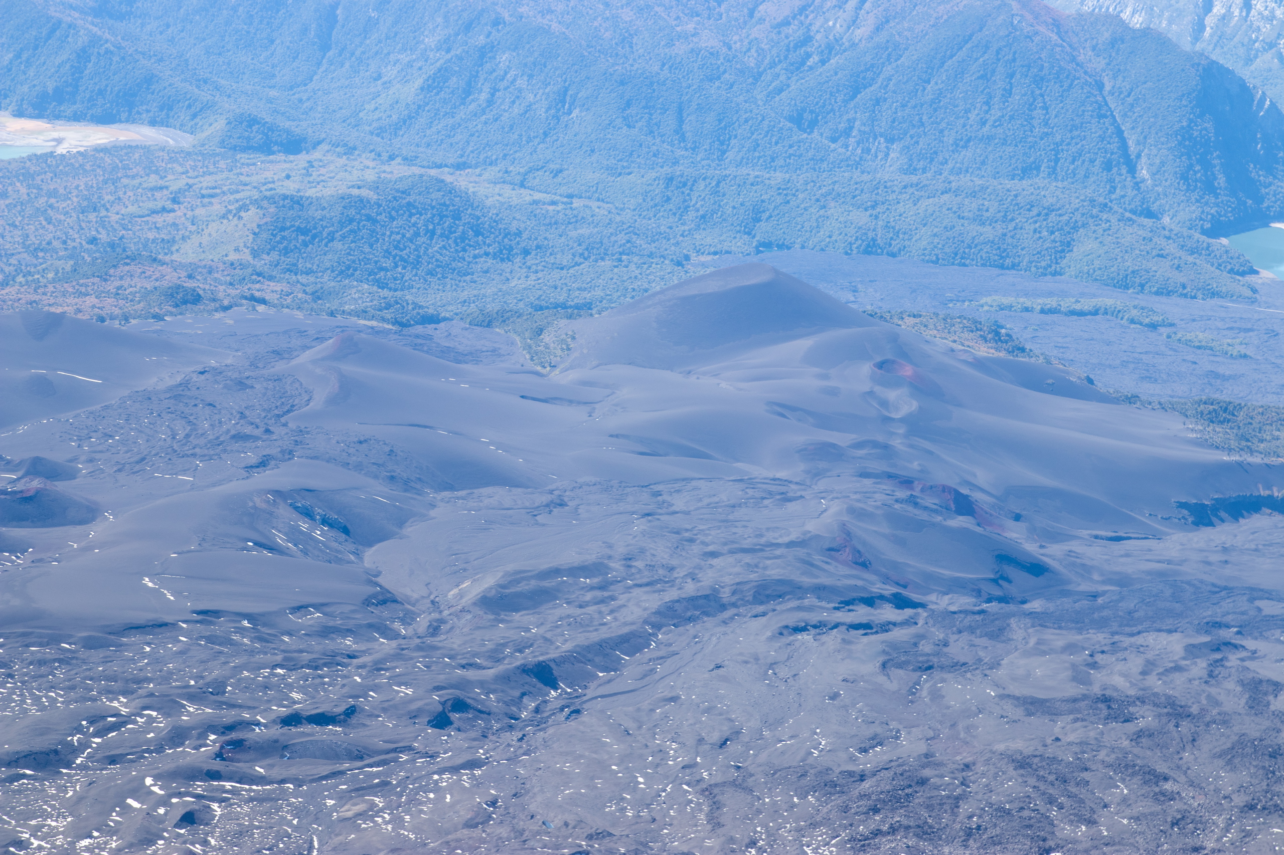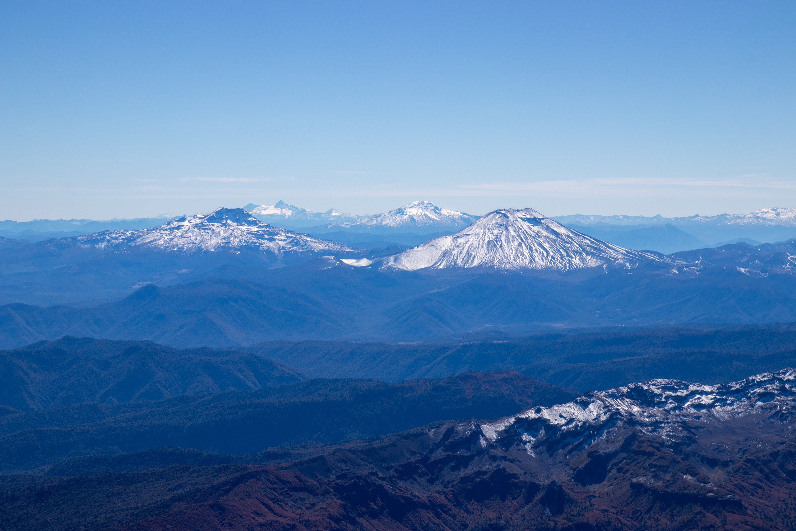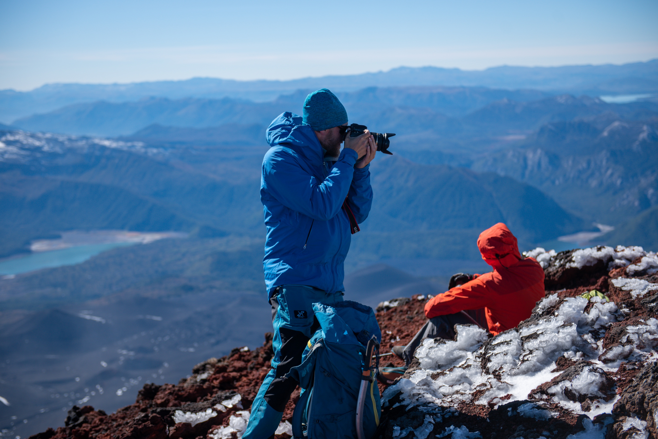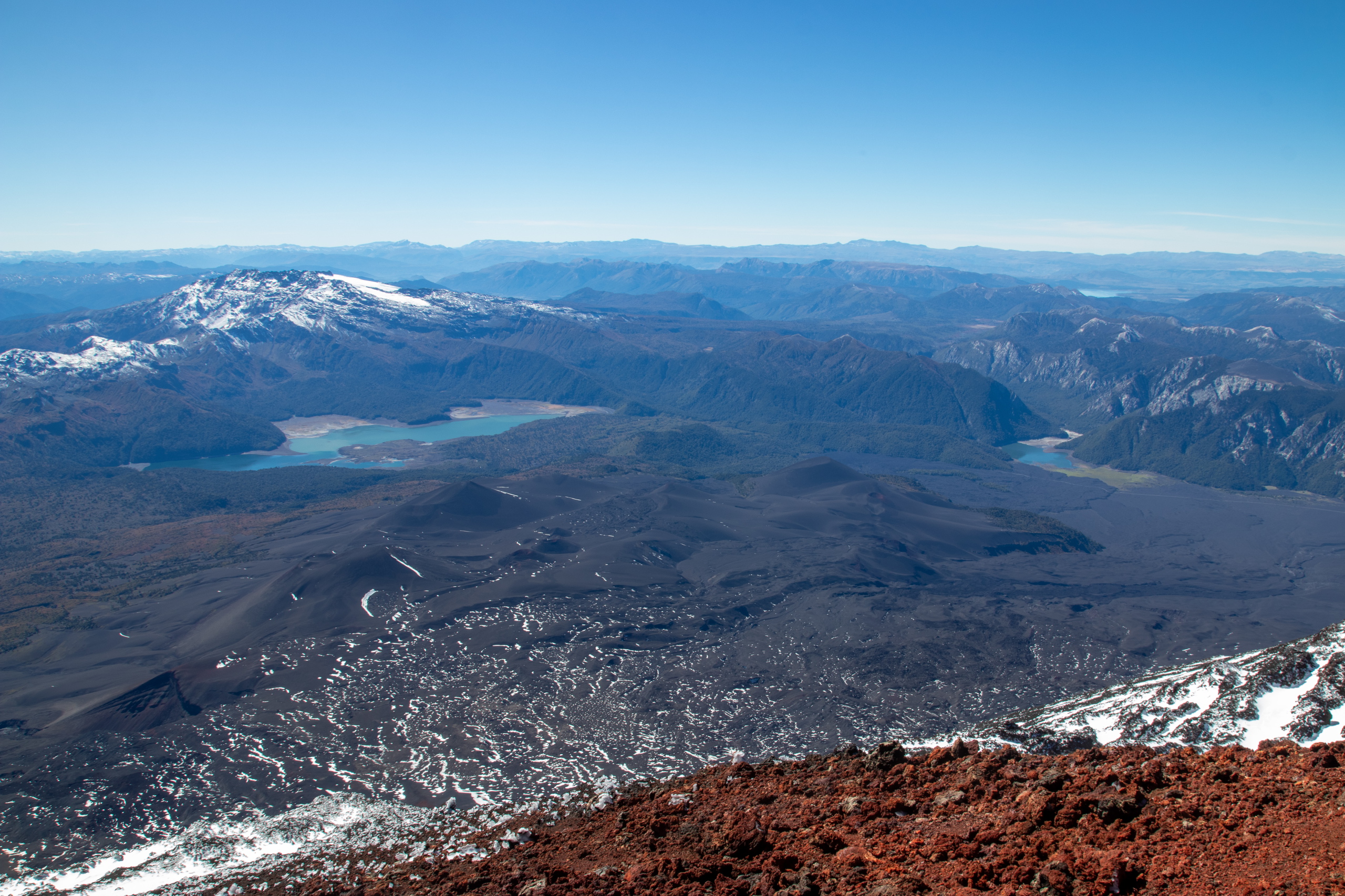 Nach fünfeinhalb Stunden sind wir am Gipfel mit herrlichem Rundumblick auf die umliegenden Berge und Vulkane. Für die Gipfeljause suchen wir uns ein windgeschütztes Plätzen und genießen die Aussicht bis zu den Bergen an der Küste. Birgit und Klemens suchen die Gipfel, die sie schon bestiegen haben. Gar nicht mal so wenige.
