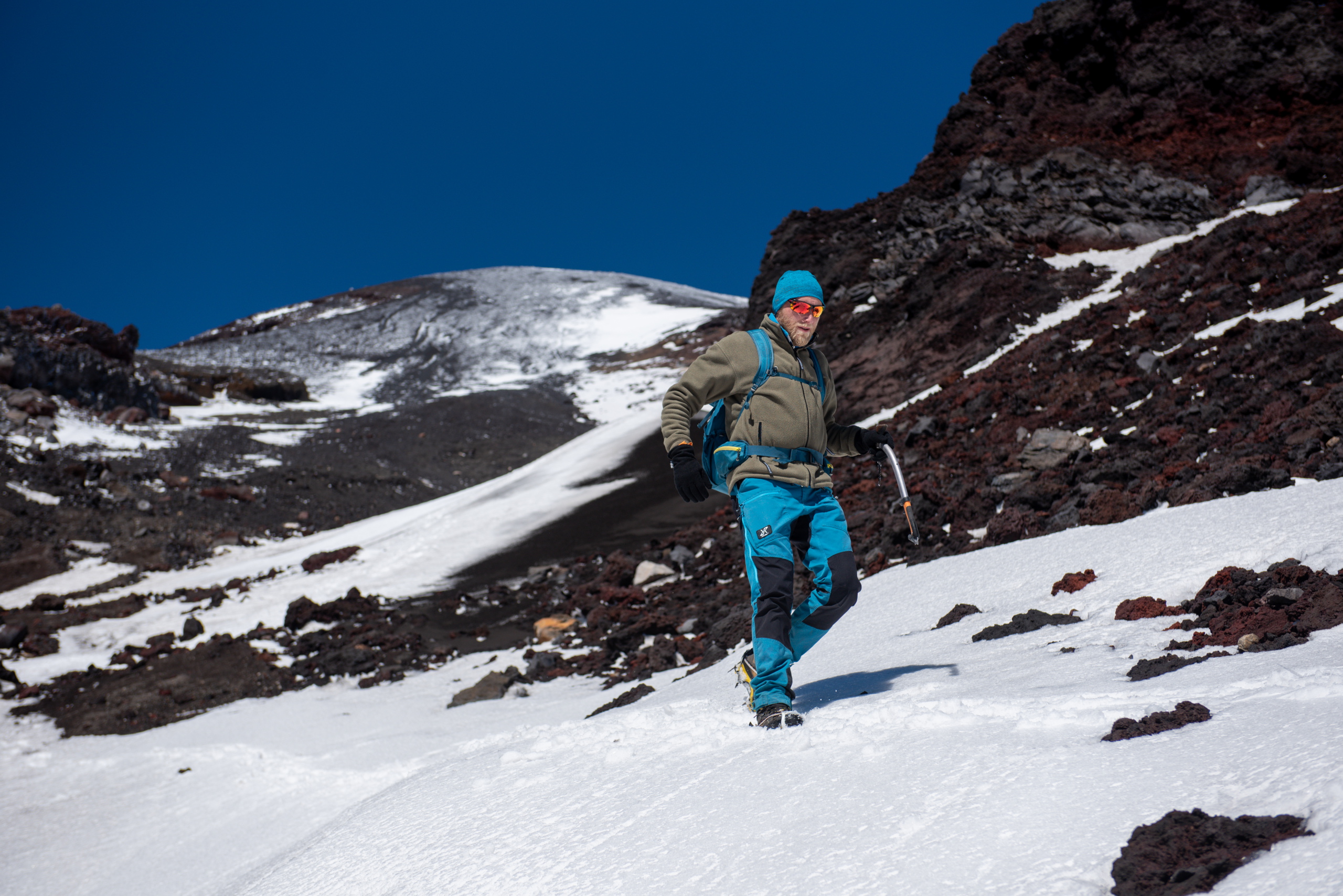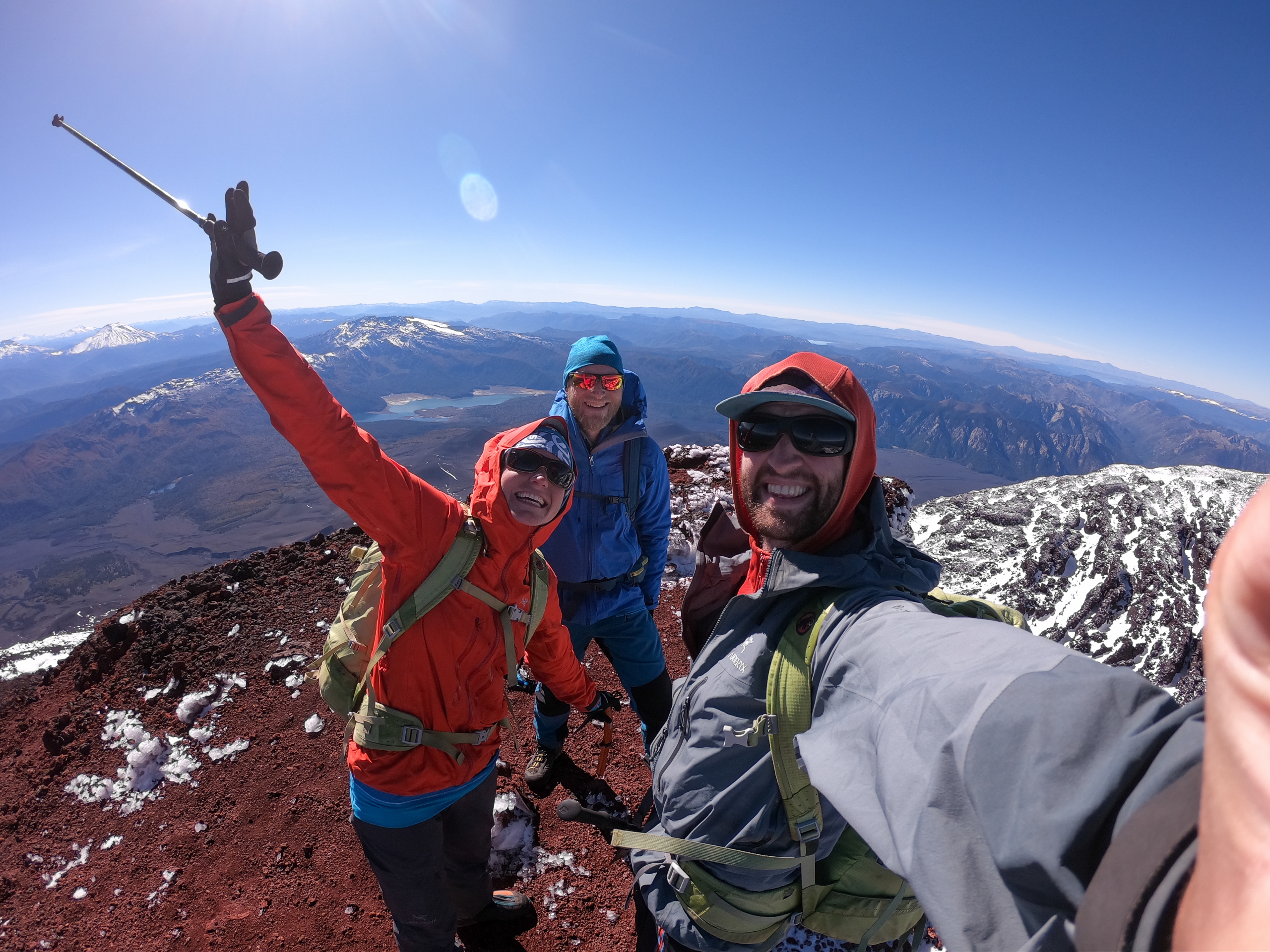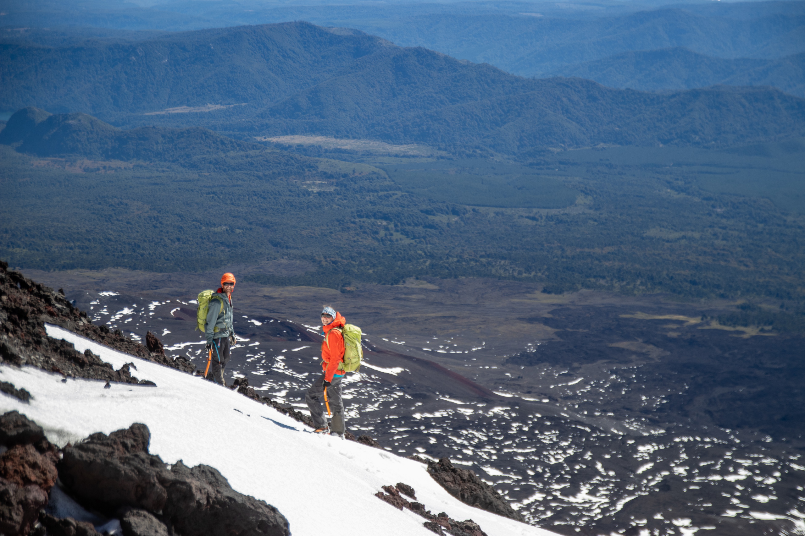 Nach nicht ganz einer Stunde beginnen wir mit dem Abstieg. Knapp unterhalb vom Gipfel pfeift eisiger Wind und wir ziehen unsere Daunenjacken und Handschuhe an. Beim Schließen meines Rucksacks bricht ein Teil meiner Schnalle ab. Grrr. Interessanterweise auch die von Brigitte und Klemens. Wohnt hier ein Schnallenbeißer? Die Sonne hat schon einen Großteil vom Eis aufgetaut und so geht der Abstieg recht gut. Die rutschige Passage umgehen wir indem wir ein 40 Grad steiles Schneefeld mit den Steigeisen rückwärts abklettern. Der weitere Abstieg macht richtig Spaß, da wir im losen Geröll in großen Schritten hinunter laufen, oder in Schneefeldern auf den Schuhen abfahren können. Am Weg durch das Lavafeld erzählen wir und lustige Geschichten von Hüttenabenden. Um drei Uhr sind wir wieder bei den Autos und schnappen erstmal ein Bier. Volcano Llaima – check.
