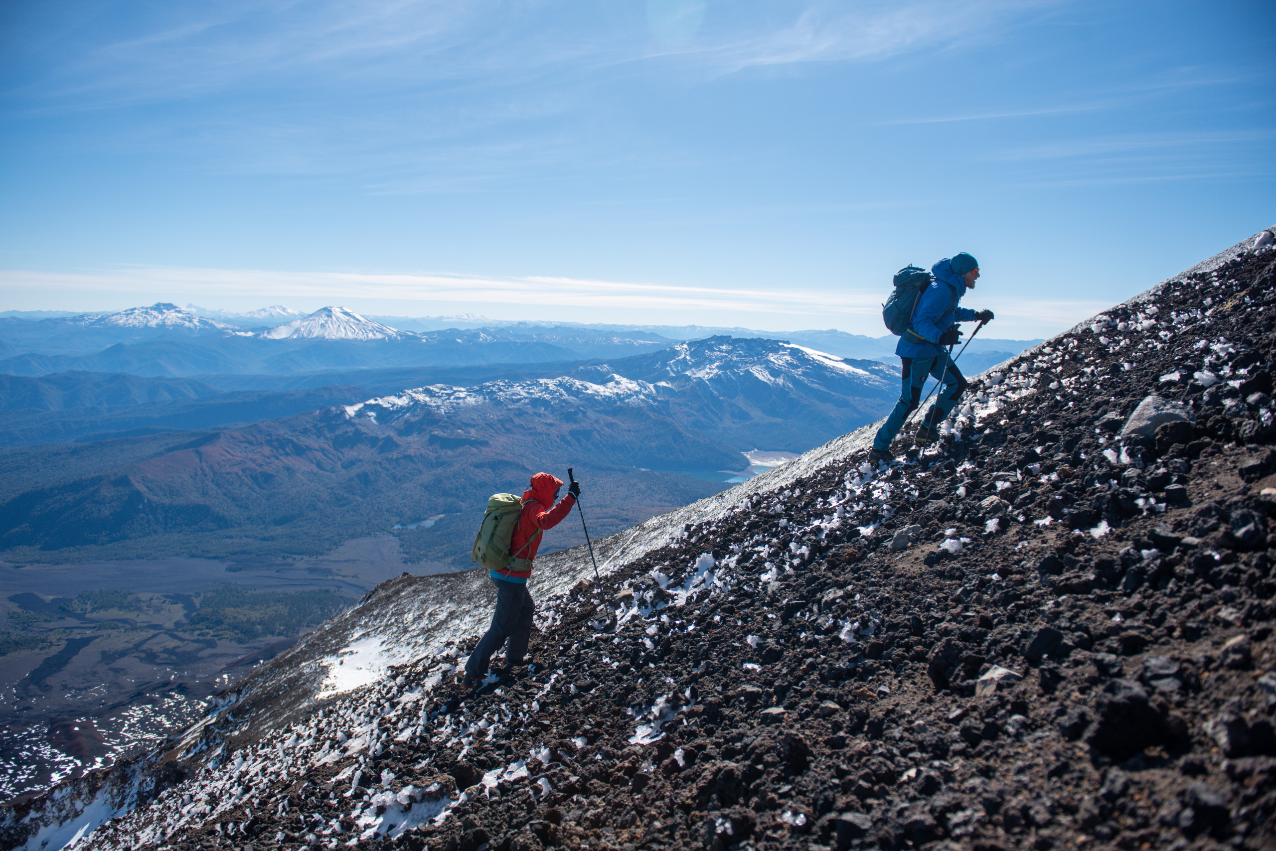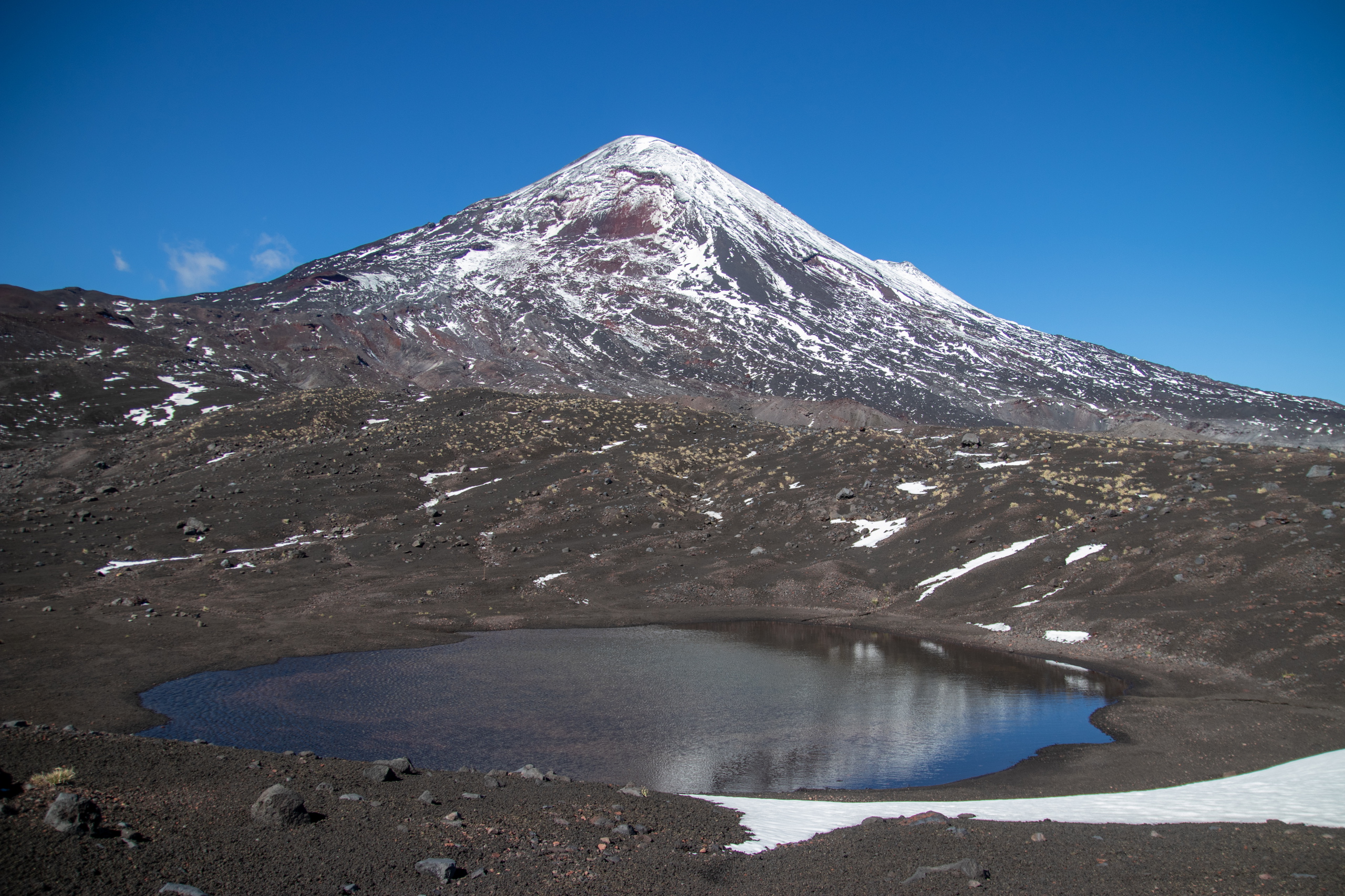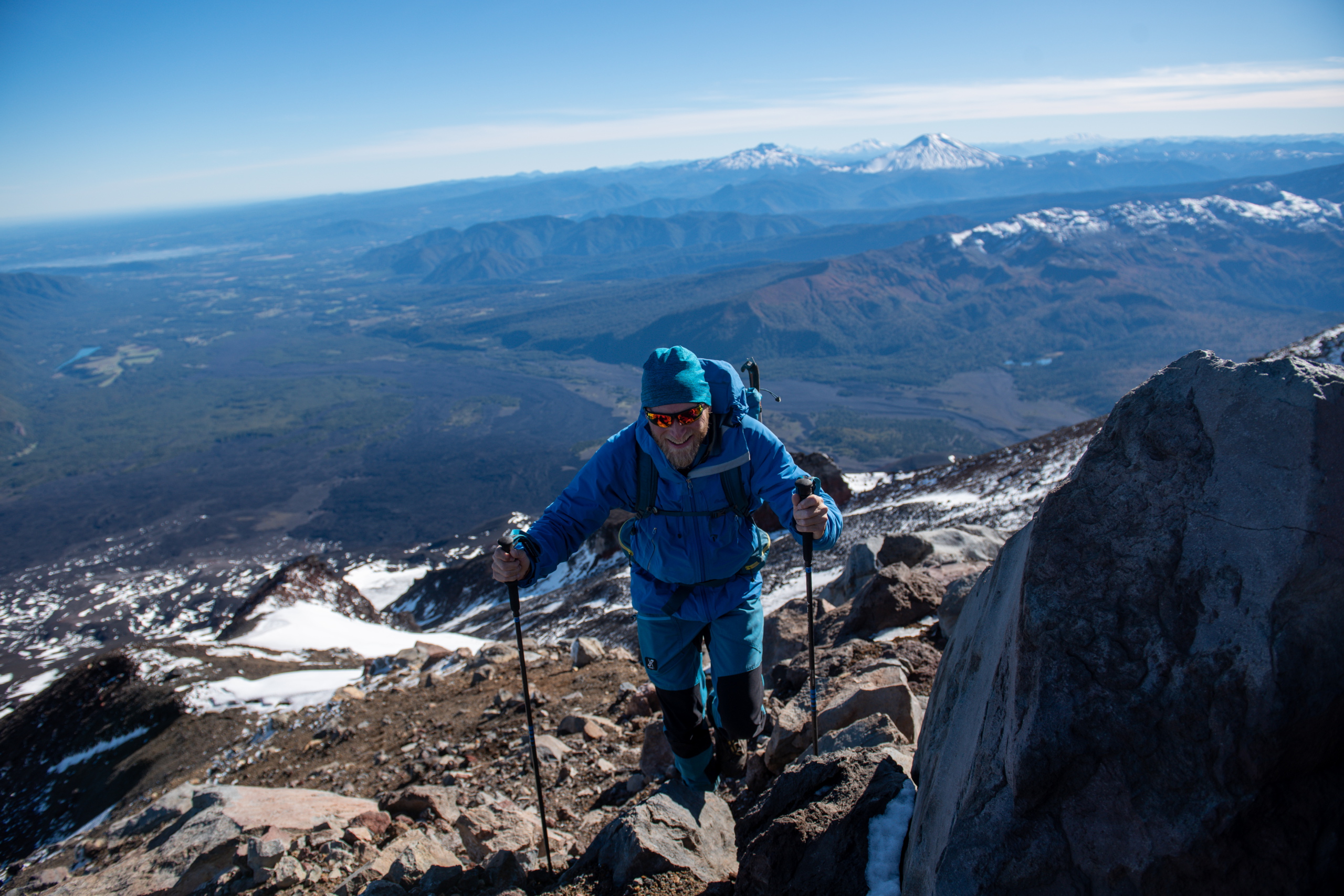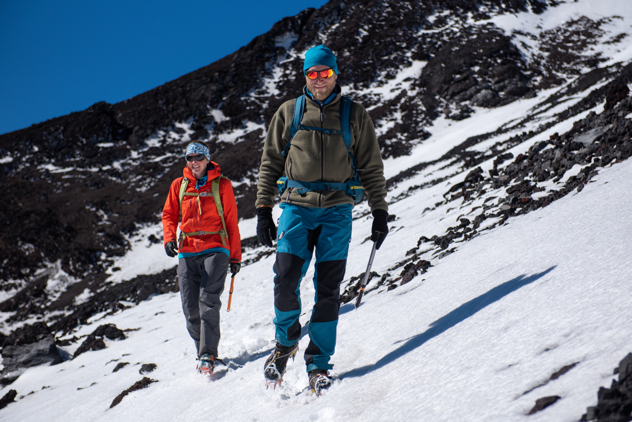 Nach nicht ganz einer Stunde beginnen wir mit dem Abstieg. Knapp unterhalb vom Gipfel pfeift eisiger Wind und wir ziehen unsere Daunenjacken und Handschuhe an. Beim Schließen meines Rucksacks bricht ein Teil meiner Schnalle ab. Grrr. Interessanterweise auch die von Brigitte und Klemens. Wohnt hier ein Schnallenbeißer? Die Sonne hat schon einen Großteil vom Eis aufgetaut und so geht der Abstieg recht gut. Die rutschige Passage umgehen wir indem wir ein 40 Grad steiles Schneefeld mit den Steigeisen rückwärts abklettern. Der weitere Abstieg macht richtig Spaß, da wir im losen Geröll in großen Schritten hinunter laufen, oder in Schneefeldern auf den Schuhen abfahren können. Am Weg durch das Lavafeld erzählen wir und lustige Geschichten von Hüttenabenden. Um drei Uhr sind wir wieder bei den Autos und schnappen erstmal ein Bier. Volcano Llaima – check.