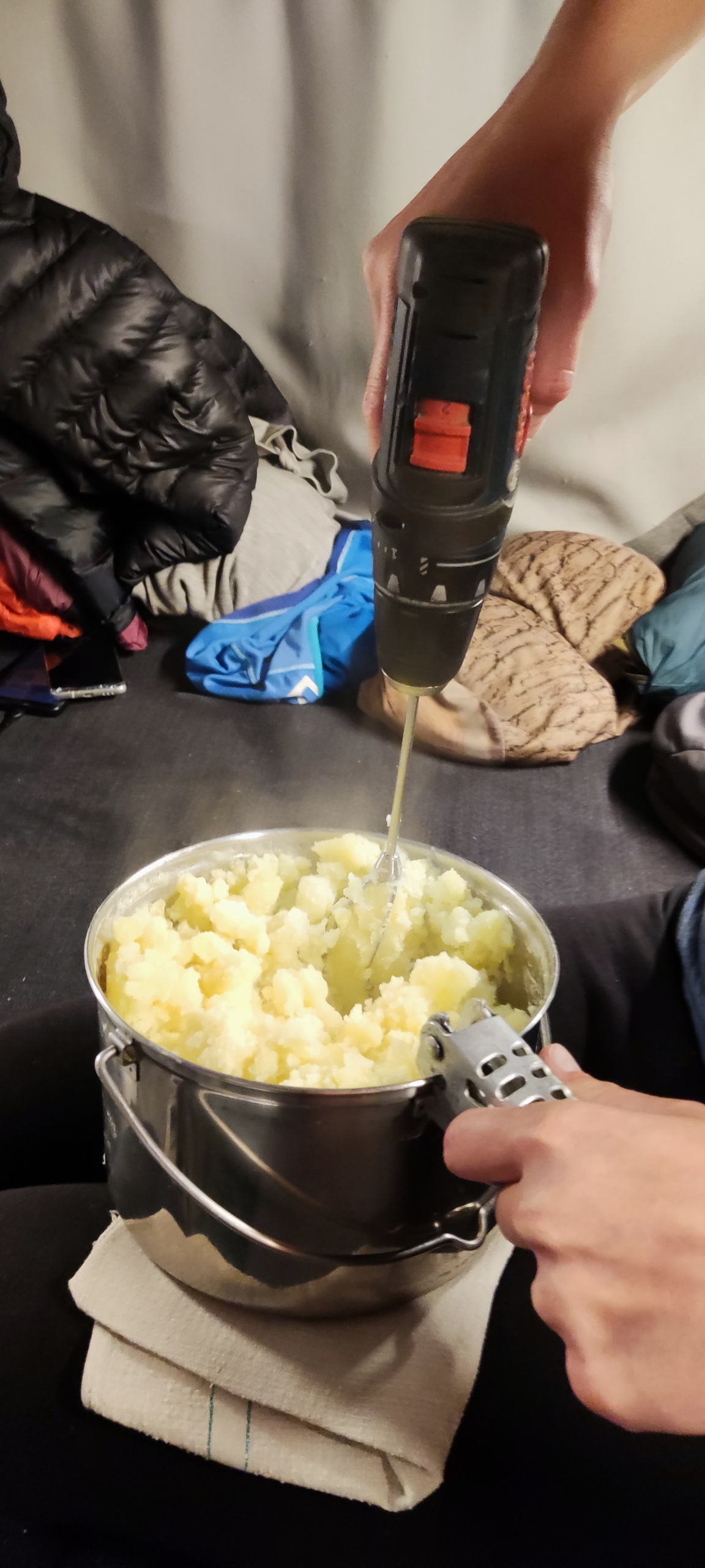 Mit Keksen und Chips gehe ich zum Wagen der beiden, wo bereits eifrig gekocht wird. Es gibt Keine-Ahnung-Mehr-Was und Erdäpfelpüree mit improvisiertem Mixer zubereitet. Wir trinken Bier und unterhalten uns sehr gut. Der Aufstieg von hier ist weiter und wir müssten sehr sehr früh los. Der Wetterbericht ist etwas unsicher und es könnte sein, das uns ein Ranger nach fast der Hälfte wieder zurück schickt. Es ist schon Mitternacht und wir sind schon sehr müde. Aufgrund der vielen Unsicherheitsfaktoren entscheiden wir uns gegen den Plan und wollen morgen das offizielle Permit holen.